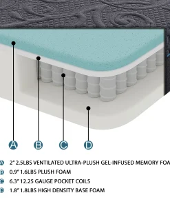 Our 11-inch mattresses feature four-layer construction that consists of: 2-inches ventilated ultra-plush gel-infused memory foam, 0.9-inch plush foam, 6.3-inch 12.25 gauge pocket coils and 1.8-inch of high-density base foam – and are offered in Twin, Full, Queen, Eastern King, California King.