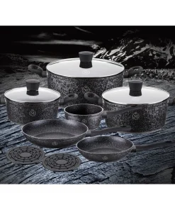 Cookware set made by Meisterklasse Exklusiv will be a perfect addition for each and every household. Set is made of aluminum and consists of 3 saucepans of different sizes together with 1 frying pan, 1 deep fry pan and 2 bakelite mats for every occasion. Perfect for all types of cooking, set has a wide variety of uses. Induction suitable Ultra non-stick perfomance Dishwasher safe Cool touch handle Energy effcient and knob Less oil needed Marble coating