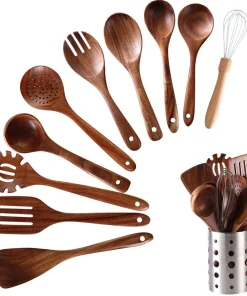 - 100% Natural Wood: Crafted from natural teak wood, these utensils showcase a beautiful wood grain and are finished with food-grade mineral plant oil. The smooth finish ensures they won’t scratch your non-stick cookware.