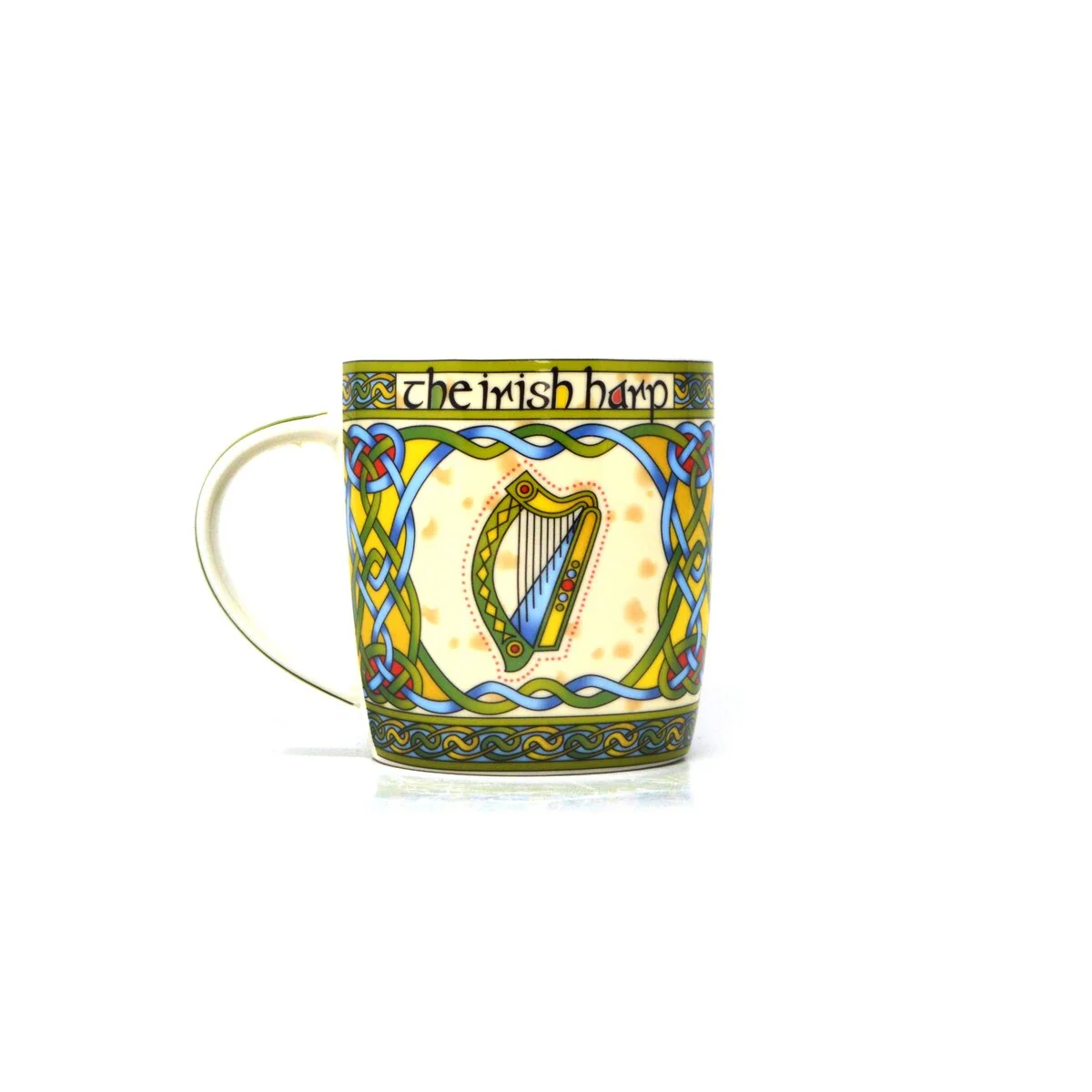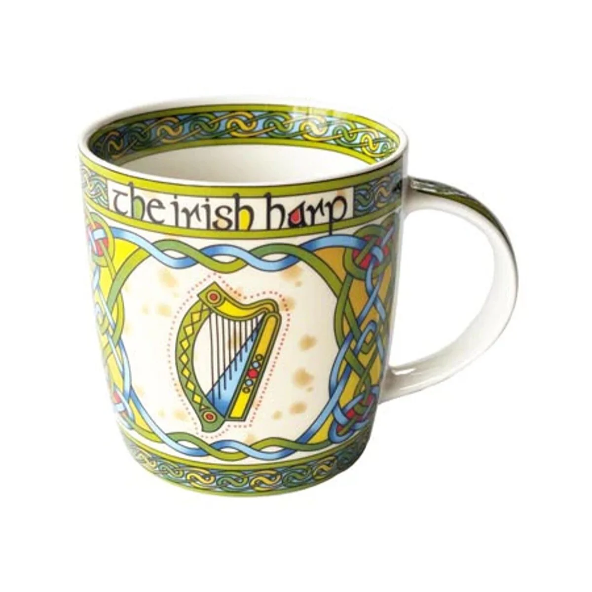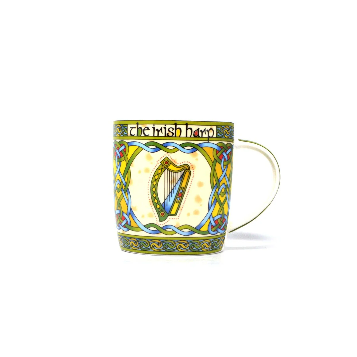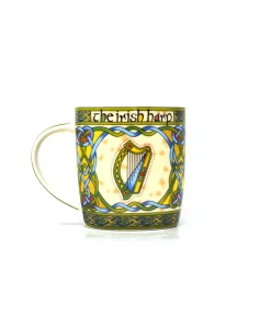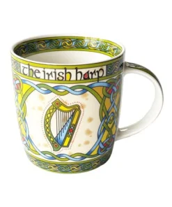 This vibrant multi-color mug is crafted from durable bone china, known for its resistance to scratches and chips as well as its excellent heat retention, making it perfect for enjoying your favorite hot beverages. Featuring an intricate design inspired by Ireland’s rich cultural heritage, the mug showcases a detailed harp motif surrounded by traditional Celtic knots and swirling patterns, echoing the artistic style of ancient Irish manuscripts like those found in the historic Book of Kells. With a comfortable capacity of 11 fluid ounces (approximately 325 milliliters), this beautifully designed mug combines both functional drinking comfort and a striking nod to classic Irish artistry, making it an exceptional choice for coffee, tea, or any warm drink.