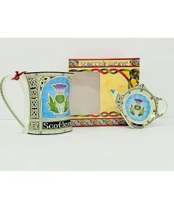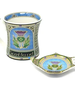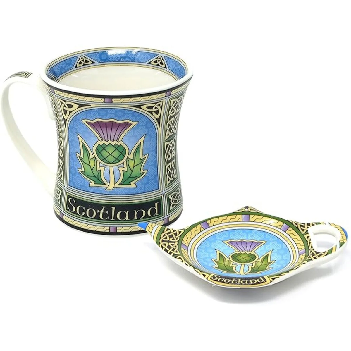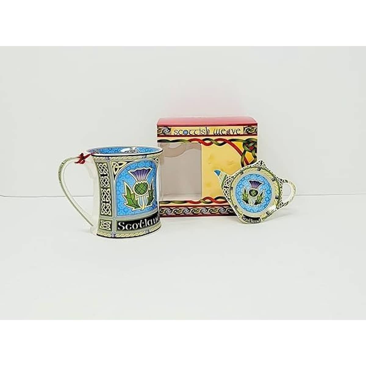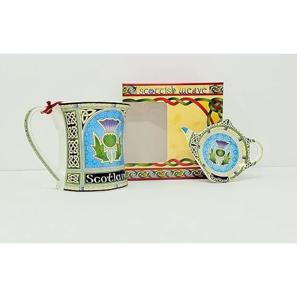 - Set contains 1 Scottish Thistle Teabag Holder & 1 Scotland Mug with Thistle in a Gift Box. This collection of Irish Weave Mug and Teabag Holder are beautifully illustrated. The Thistle is Scotland’s unofficial emblem. The print is written in Scotish script style similar to that in the famous Book of Kells.