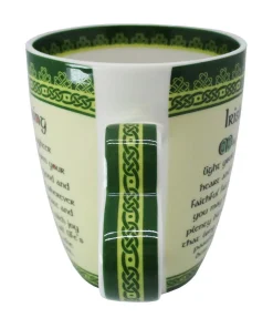 - The design of this cup is inspired by traditional Celtic artwork and features intricate spirals that add a stylish touch to any table setting. The Irish Blessing phrase is also prominently displayed, making it a meaningful and thoughtful gift.