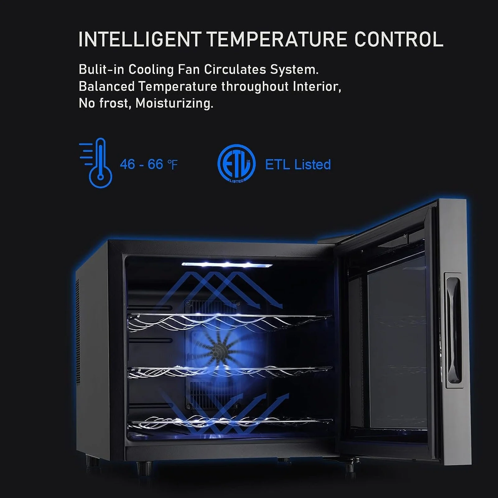 Built – in Cooling Fan: An internal cooling fan circulates the air, ensuring balanced temperature throughout the interior. It also prevents frost buildup and maintains proper humidity levels to keep your wine in prime condition.