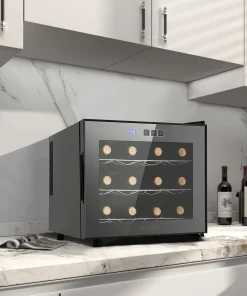 The 12 – bottle Wine Cooler Refrigerator is a sleek and functional appliance designed to store and preserve wine at optimal conditions. With its modern black exterior and glass door, it not only looks great but also provides a clear view of your wine collection.