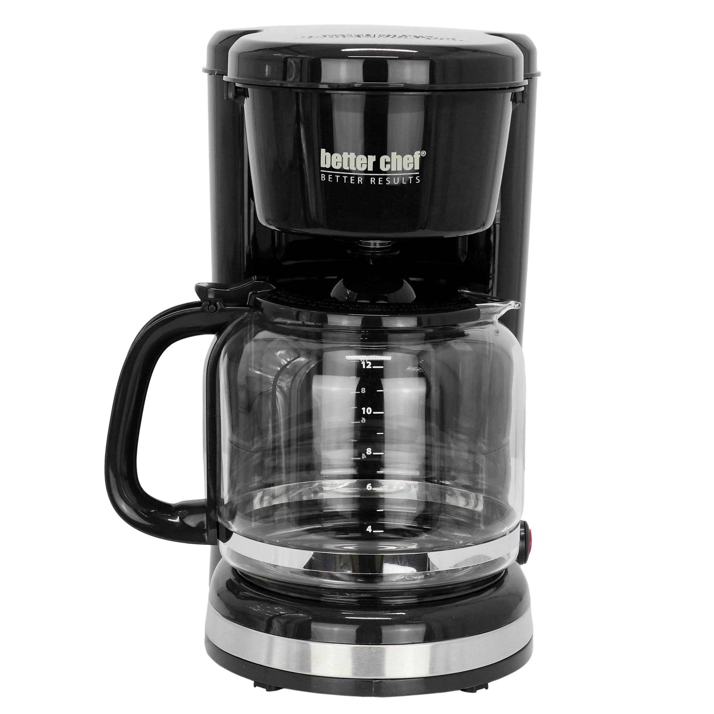 Never go without your morning coffee thanks to the Better Chef 12 Cup 900 Watt Coffee Maker. This basic coffee maker is super easy to use, simply fill the swing-out filter basket with ground coffee and turn on the power switch to start brewing. The sturdy glass coffee pot holds a generous 12 cups of coffee, plenty for you and other members of your household. Keep your counter tidy with a hidden storage space under the unit to store the power cord. A hot cup of coffee is just a click away with this Better Chef coffee maker. Item Dimensions: 11.90" x 8.50" x 7.00" Item Weight: 3.00lbs