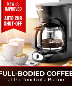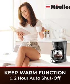 Generous Capacity & Durable Design: Glass carafe with 60oz capacity, this allows you to brew a large amount of coffee up to 12 full cups, or simply choose 2 or 4 at a time. It has an easy-grip handle for comfortable, drip-free pouring. The dishwasher safe carafe coffee pot is made of high-quality, non-porous borosilicate glass, which won’t absorb odors, while its superb heat-resistance will keep your coffee hotter for Ionger. Reusable Eco-Filter: Our permanent filter technology not only enriches the flavor of your coffee but also saves you the cost and waste of disposable filters. Easy to remove and clean, however filter paper can still be used if you prefer. Savor the flavor in every refill. Improved Keep Warm Safety: Our keep-warm function maintains your coffee’s temperature, ensuring your last cup is as warm as the first. After your machine has brewed a fresh carafe of coffee, the warming plate will retain heat, and then will automatically turn off after 2 hours. Perfect for busy mornings or leisurely brunches. (*Not compatible with Smart devices.) Thoughtful Features: The Mueller coffee machine comes with a non-drip carafe and non-slip feet for stability, ensuring your brewing experience is clean and safe. Superior Quality With Mueller – We are here to offer you only the best quality products designed to make your life easier. If you need any help, please feel free to contact us.Â