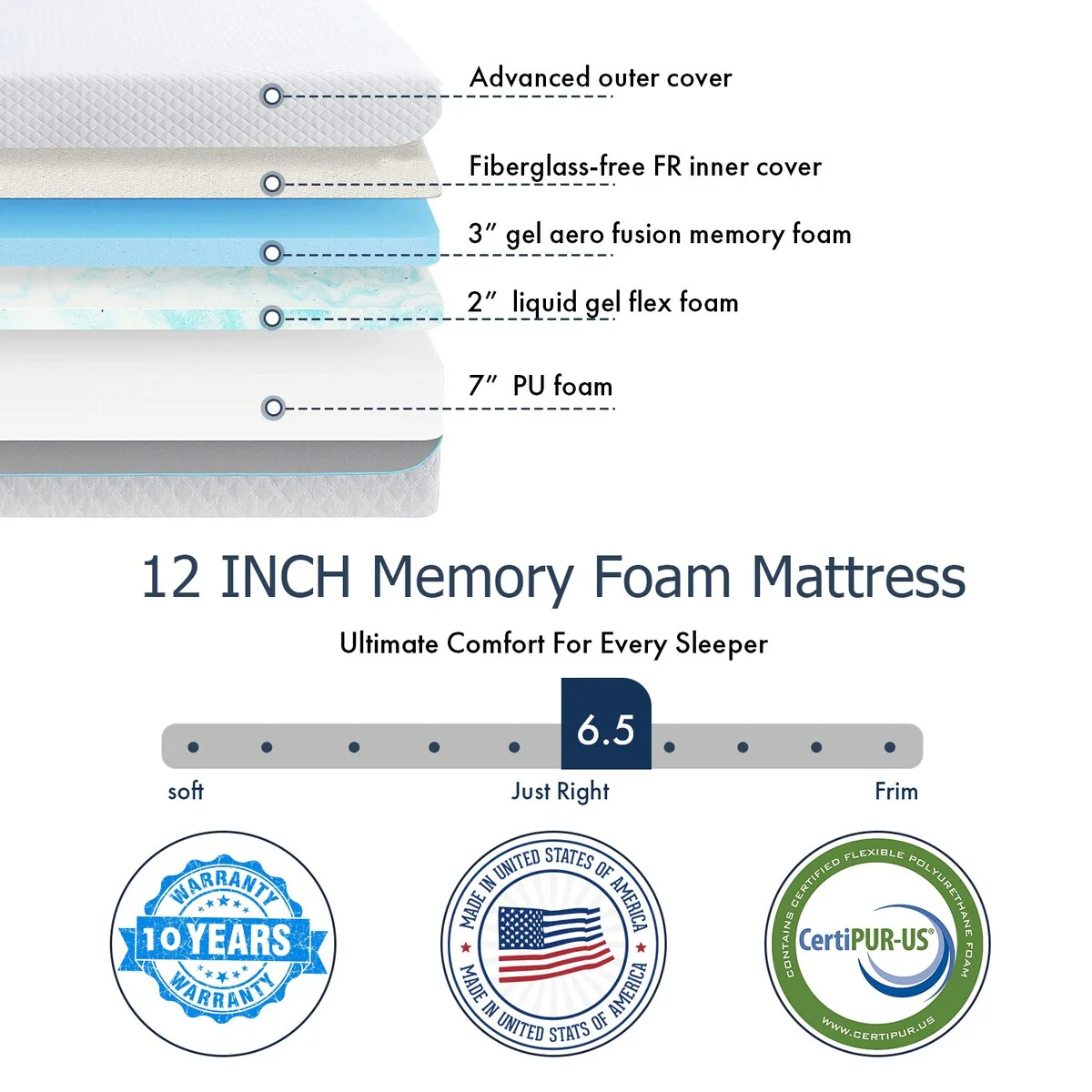 12 inch Gel Memory Foam Mattress, Cooling Medium Feel Bed Mattress in a Box, CertiPUR-US