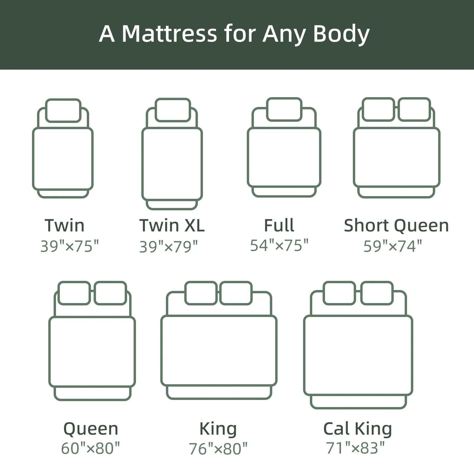 - Queen: 60 inches wide x 80 inches long x 12 inches thick