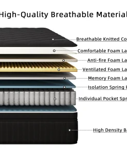 - Advanced Dual-Layer Support System – Engineered with hundreds of individually wrapped pocket coils that provide targeted support and responsive bounce, perfectly paired with premium comfort layers of contouring memory foam, temperature-regulating gel infusion. This innovative combination creates the ideal balance – the coils maintain proper spinal alignment while the foam layers cushion pressure points at shoulders and hips for truly restorative sleep.
