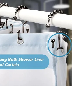 Engineered spherical roller balls of shower curtain hooks can glide smoothly and fast across the shower rods. Open and close your shower curtain easily. - Double hooks design