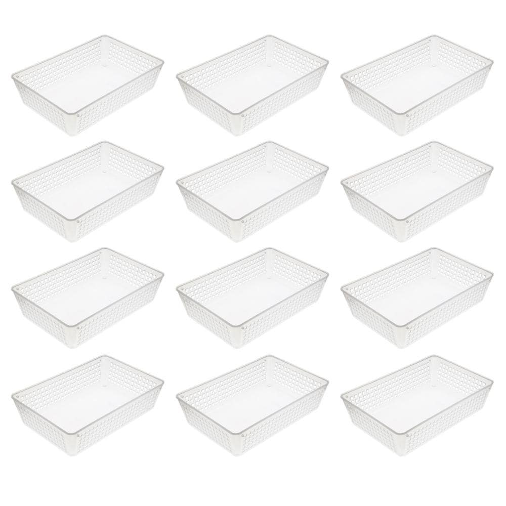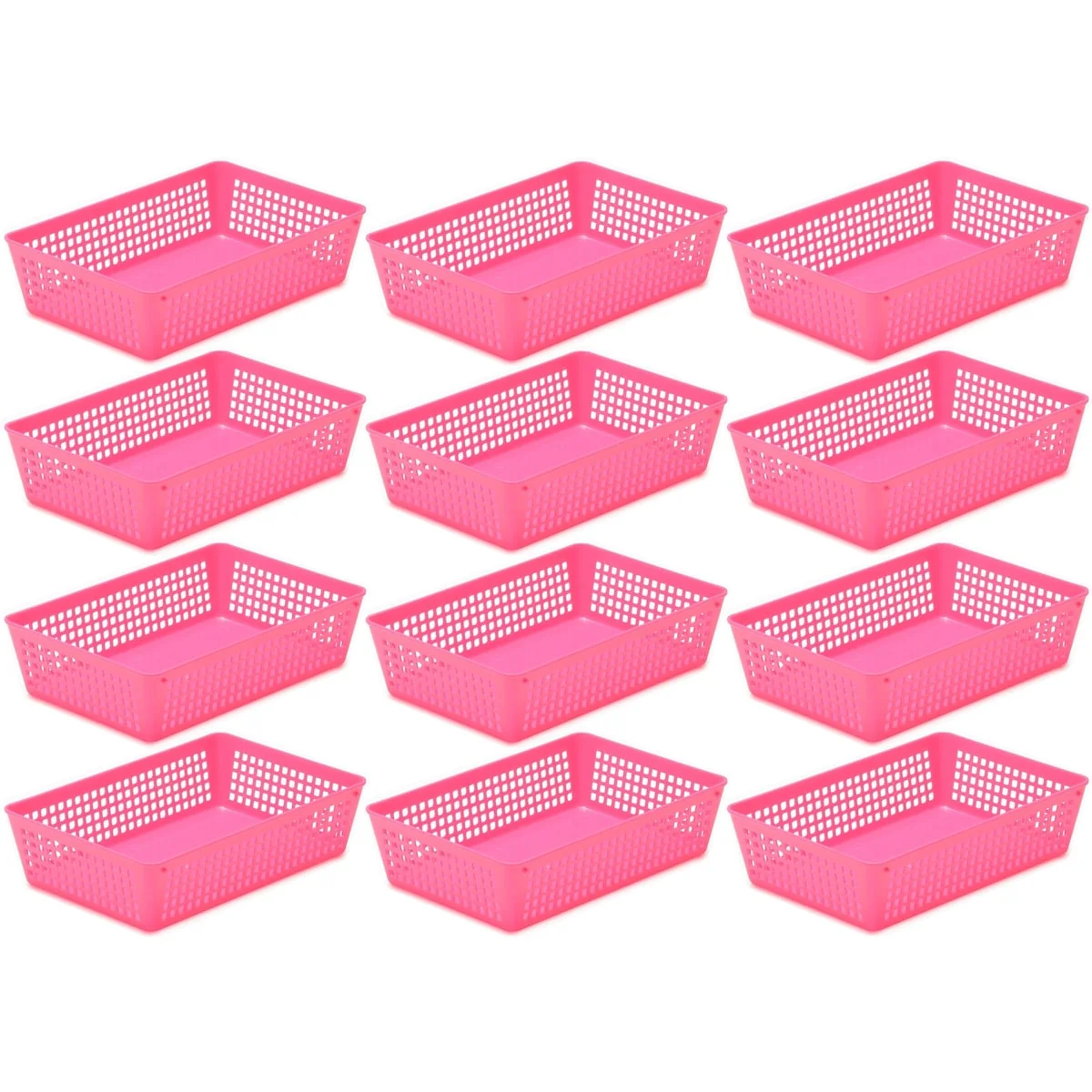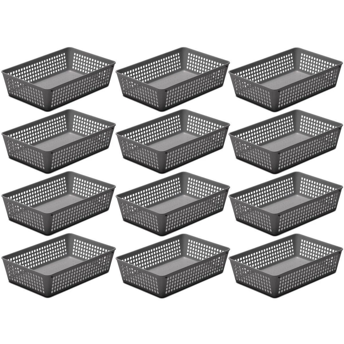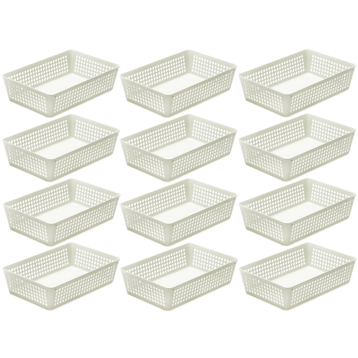 Whether you need to organize the kitchen pantry, bathroom shelves, closet, or kids room, these plastic baskets expedite the process to keep everything organized and easy to access. These baskets are solidly made to contain small items and heavy objects in drawers, desktops, shelves, and pantries without acting flimsy or wobbly. Featuring vented holes for airflow, they are made of BPA-free plastic material and withstands common tear and wear for long-term durability.