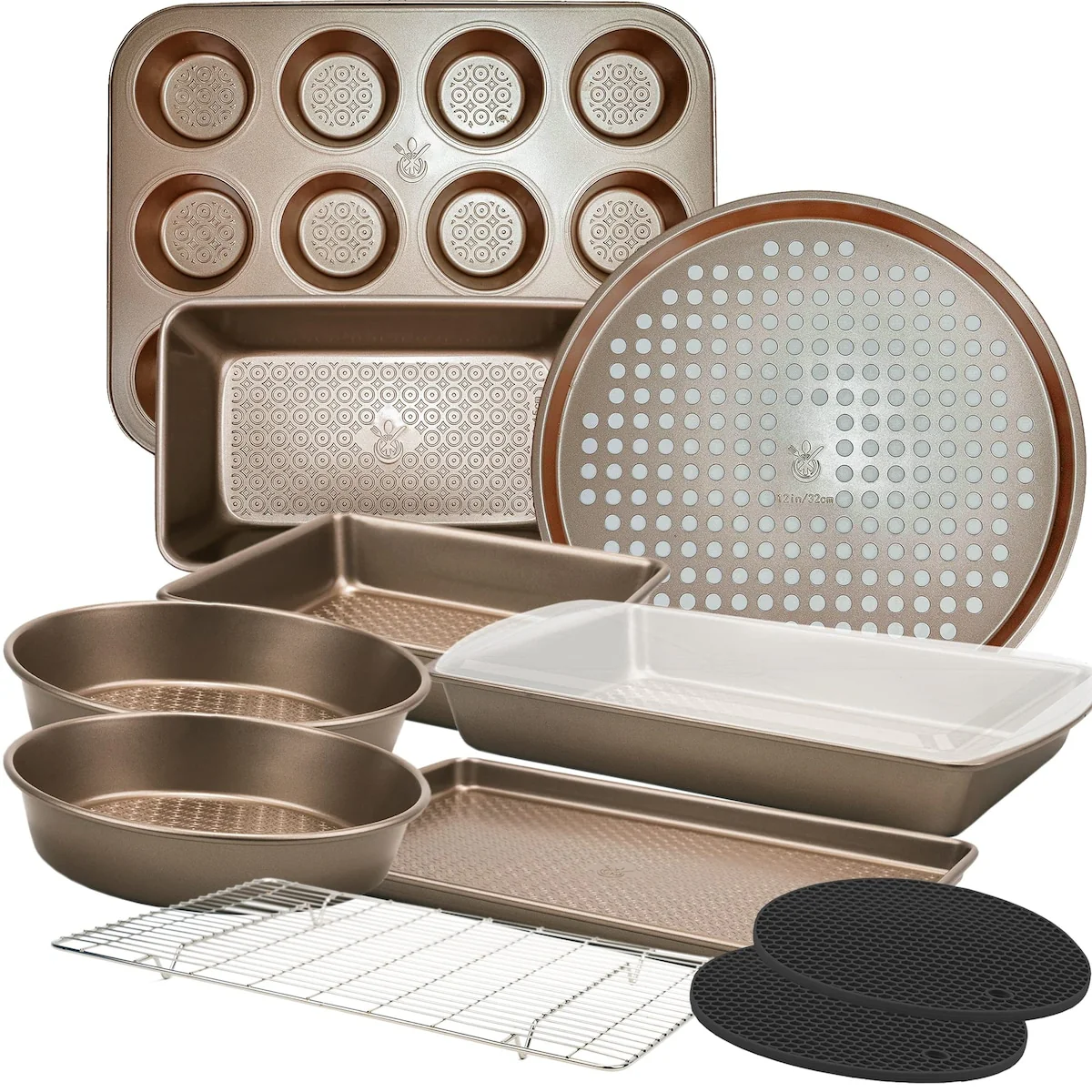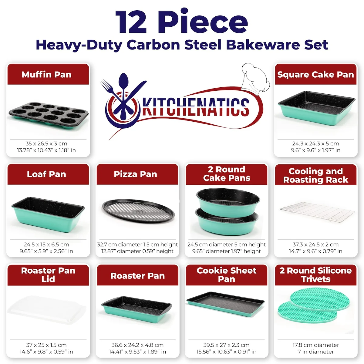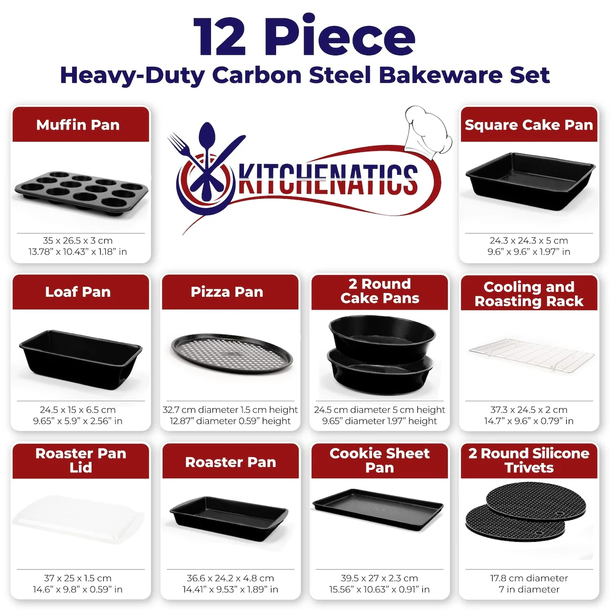 EVERYTHING YOU NEED: The 12-PC nonstick bakeware set includes 2 round pans, loaf pan, square cake pan, large cookie sheets for baking nonstick set, cooling rack, roaster pan with lid, muffin pan, pizza pan, and 2 round silicone trivets.