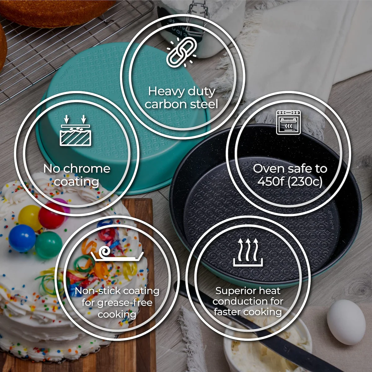 DURABLE & LONG LASTING: The black non-stick baking pan set is made from premium quality carbon steel while the cooling racks are made with 304 stainless steel. The bake pans are PFOA, PFOS, PTFE Free. Also available in champagne & turquoise colors. Make sure you look for high quality kitchenware for baking for long lasting use.