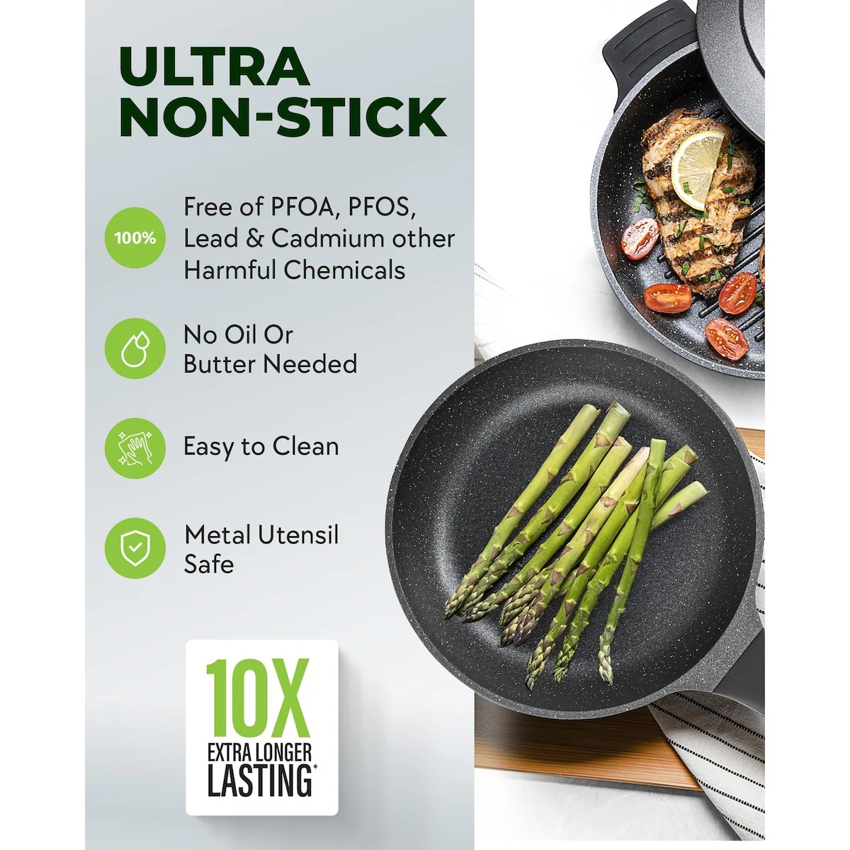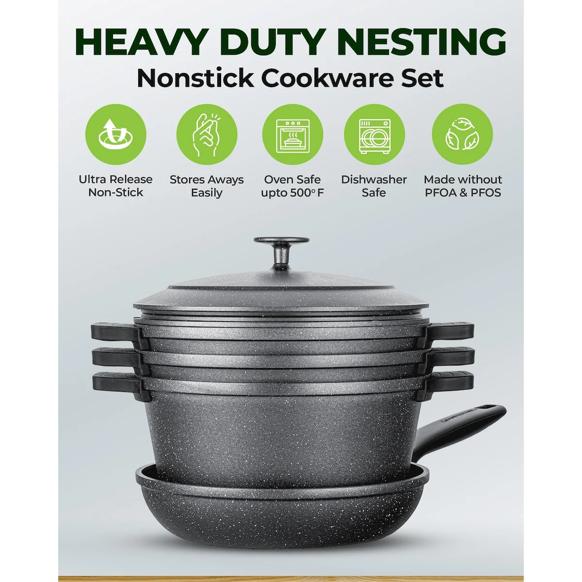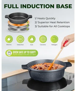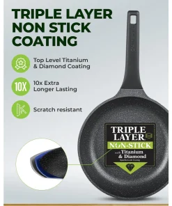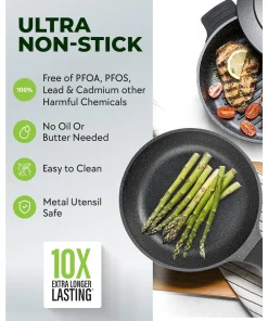 100% HEALTHY AND NON TOXIC: Each Piece of cookware is free of PFOA, PFOS & other harmful chemicals including lead & cadmium, allowing you to Keep a healthy, toxin free, and ecofriendly cooking environment.