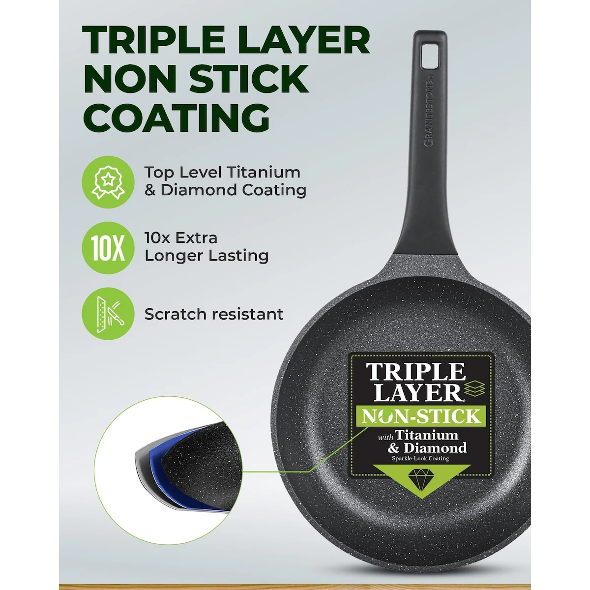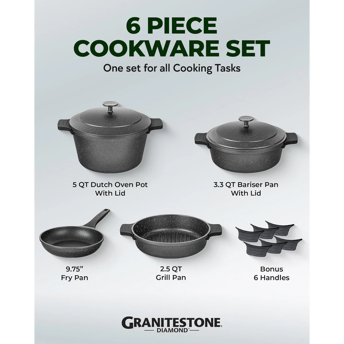 LONG LASTING NONSTICK: Think healthier foods, easy food release, and an effortless cleanup for years to come with the nonstick pots and pans set- Each piece of cookware is generously coated 3x with nonstick coating and reinforced with diamonds to deliver up to 10x longer lasting nonstick performance. No oil or butter needed, makes for healthier eating, and provides for hassle free, 1-2-3 cleanup.