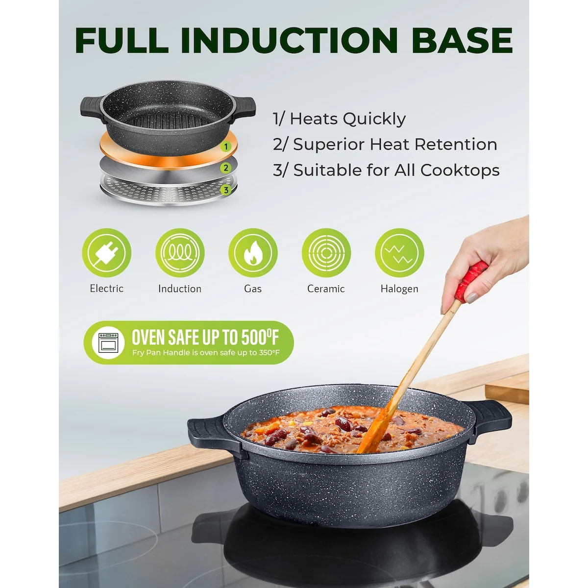 STOVETOP AND OVEN SAFE: Each piece of cookware is compatible with all types of stovetops- Gas, electric, halogen, and ceramic – besides induction, allowing you to cook virtually anywhere you’d like.