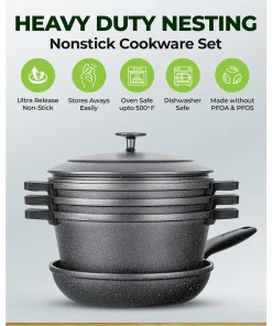 NESTING COOKWARE SET: The 6 Pc nesting nonstick cookware set is designed to provide everything needed in a kitchen to cook like a pro without taking up the same amount of storage space compared to other commercial pots and pans set. Simply stack each pot and pan and reduce the amount of storage taken by up to 70%!