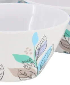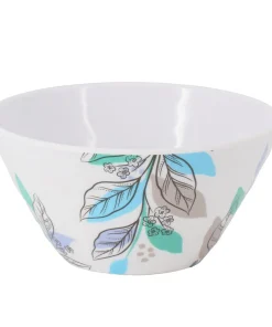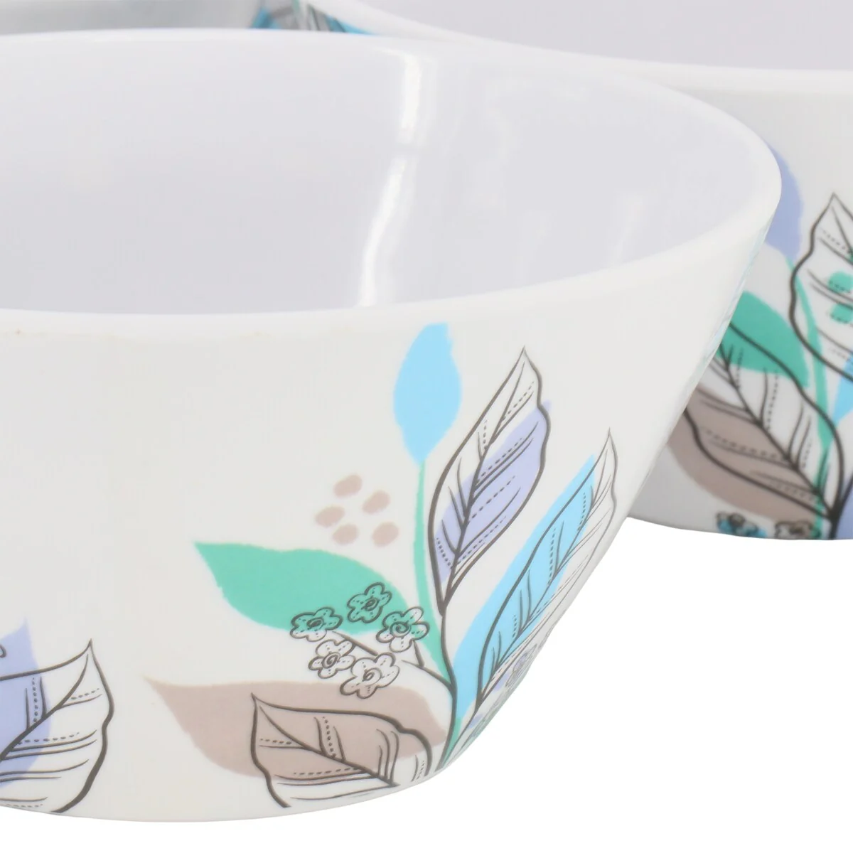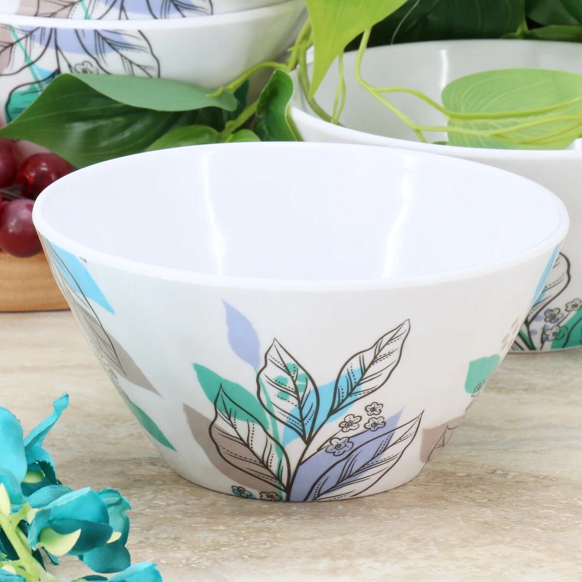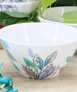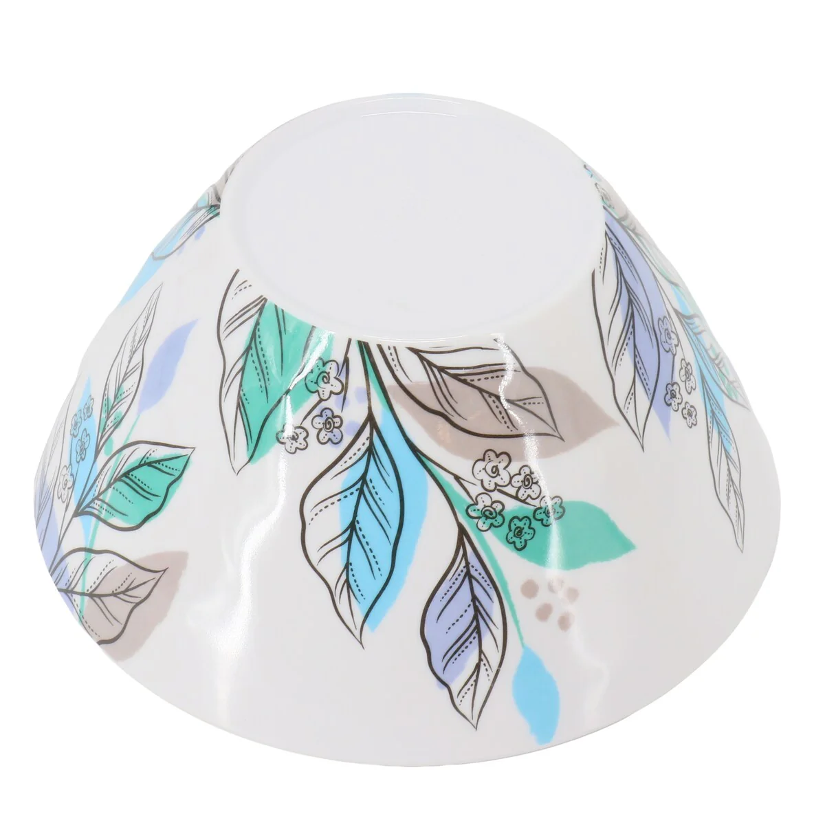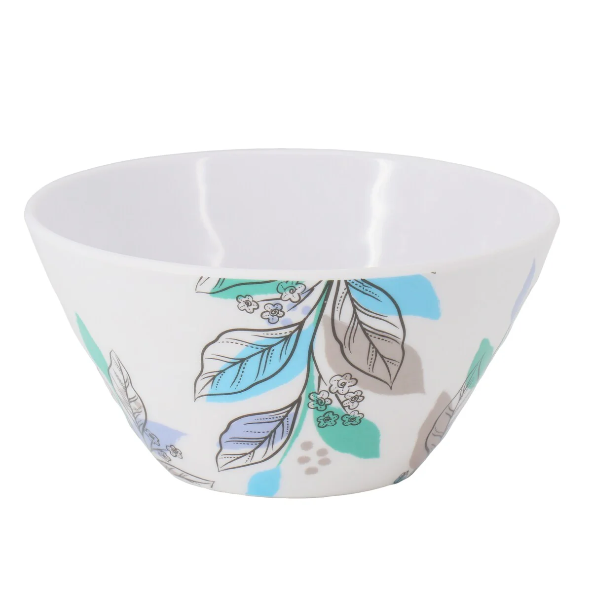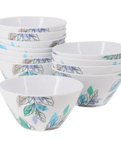 Liven up your dishware with this 12 piece plastic bowl set by Gibson Home. This bowl set is constructed with lightweight durable melamine that is top rack dishwasher safe for easy clean up. Each bowl features a blue leaf decal design and a hammered texture that will give a colorful accent to your favorite meals. The vibrant colors and fun design is perfect for outdoor gatherings, dining with kids, and every day use alike. Stack-able design makes it easy to save space while storing. Add some pattern and color to your cabinets with this tropical set! Item Dimensions: 6.00" x 6.00" x 3.00" Item Weight: 0.35lbs