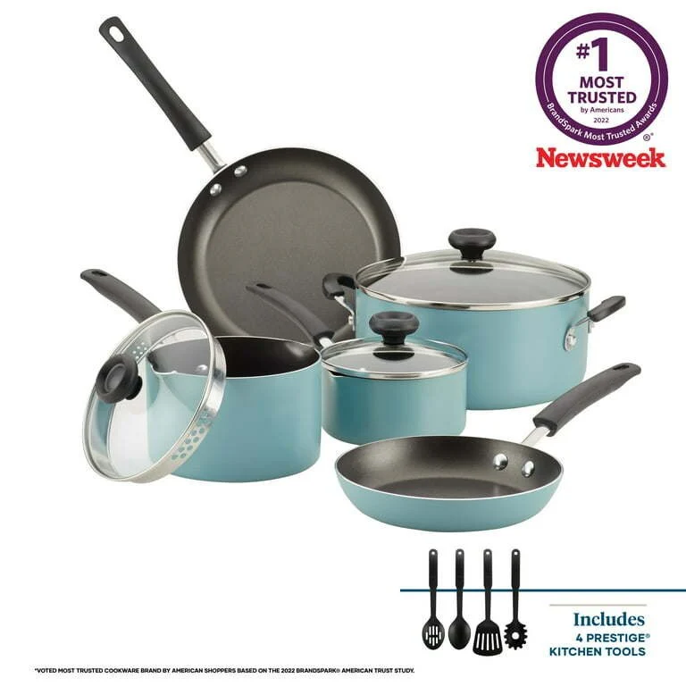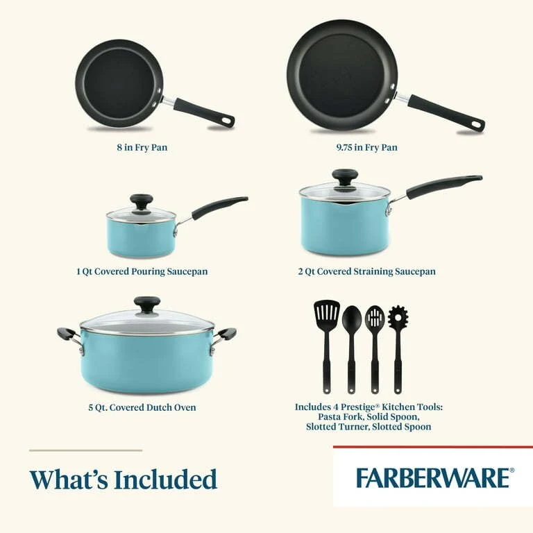 The pots and pans come with four nonstick-safe Prestige nylon kitchen tools and a Quality Assurance Guarantee 1-Quart & 2-Quart Covered Saucepans, 5-Quart Covered Dutch Oven, 8-Inch & 9.75-Inch Skillets; Four Prestige Nylon Tools: Slotted Spoon,Solid Spoon, Slotted Turner, Pasta Fork.