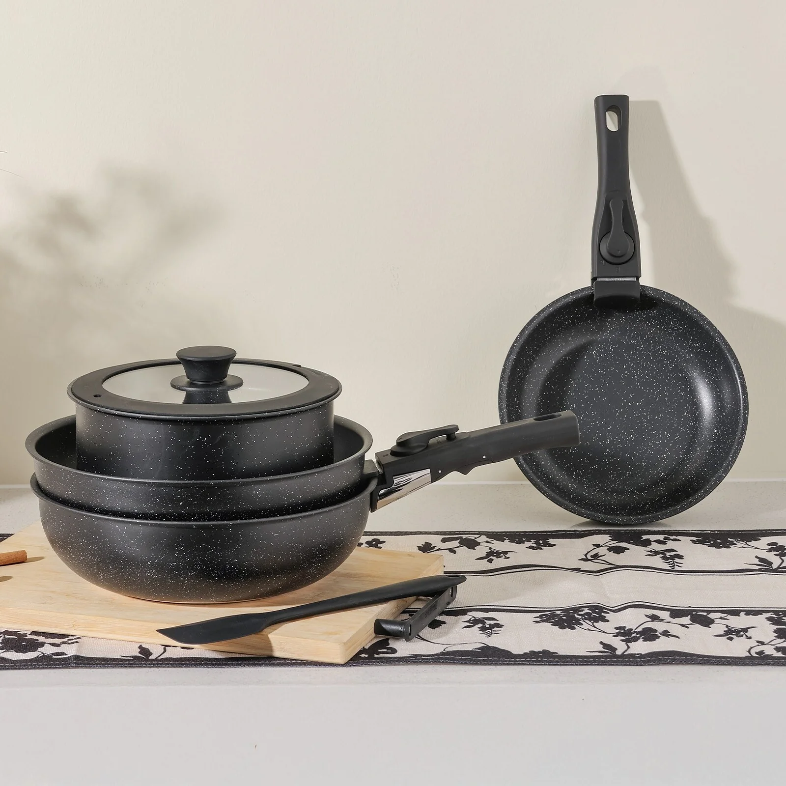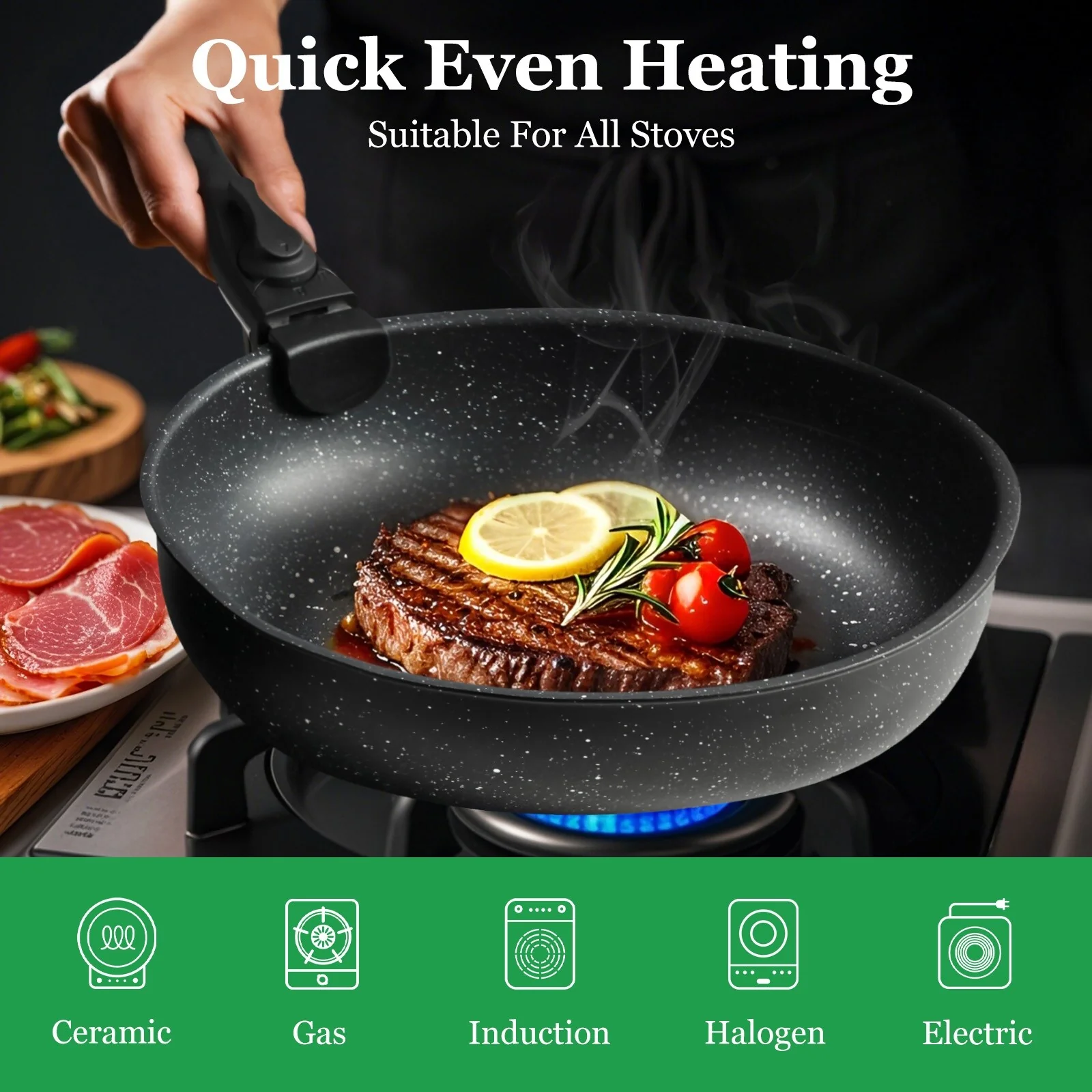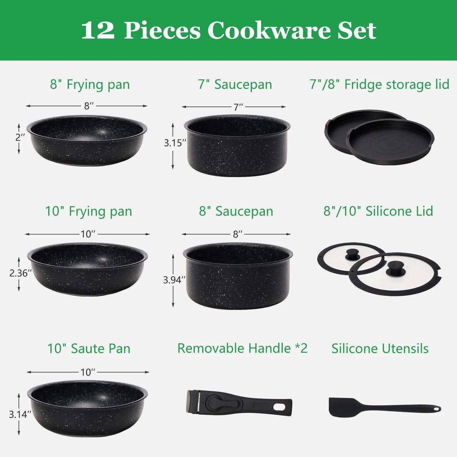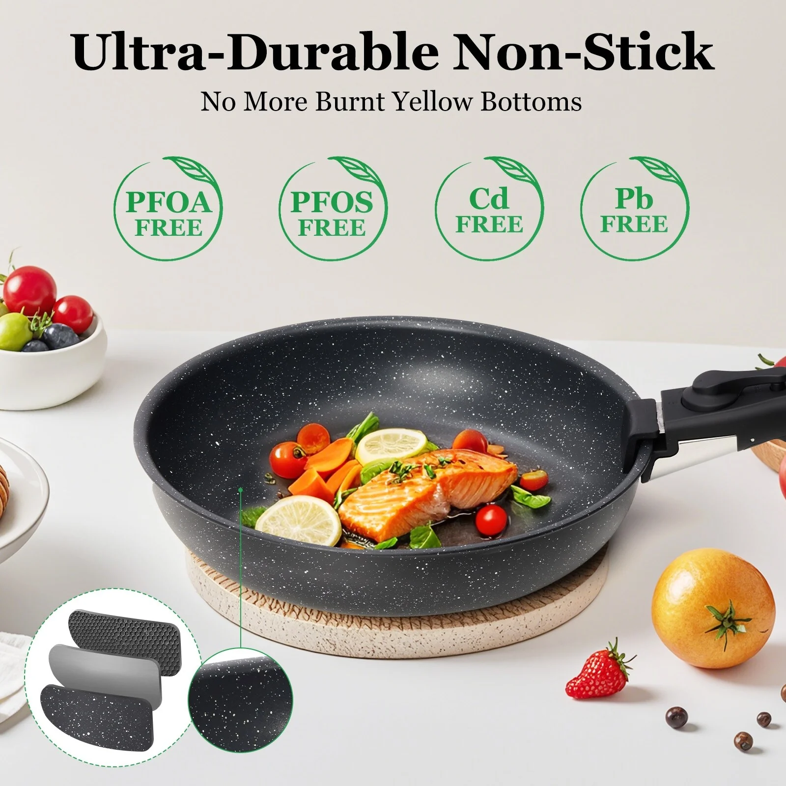 - 【Complete Cookware Set】This versatile set includes a 7" saucepan, 8" saucepan, 8" frying pan, 10" frying pan, 10" sauté pan, 7"/8" fridge storage lids, 8"/10" silicone lids, silicone utensils, and 2 removable handles—everything you need for effortless cooking.