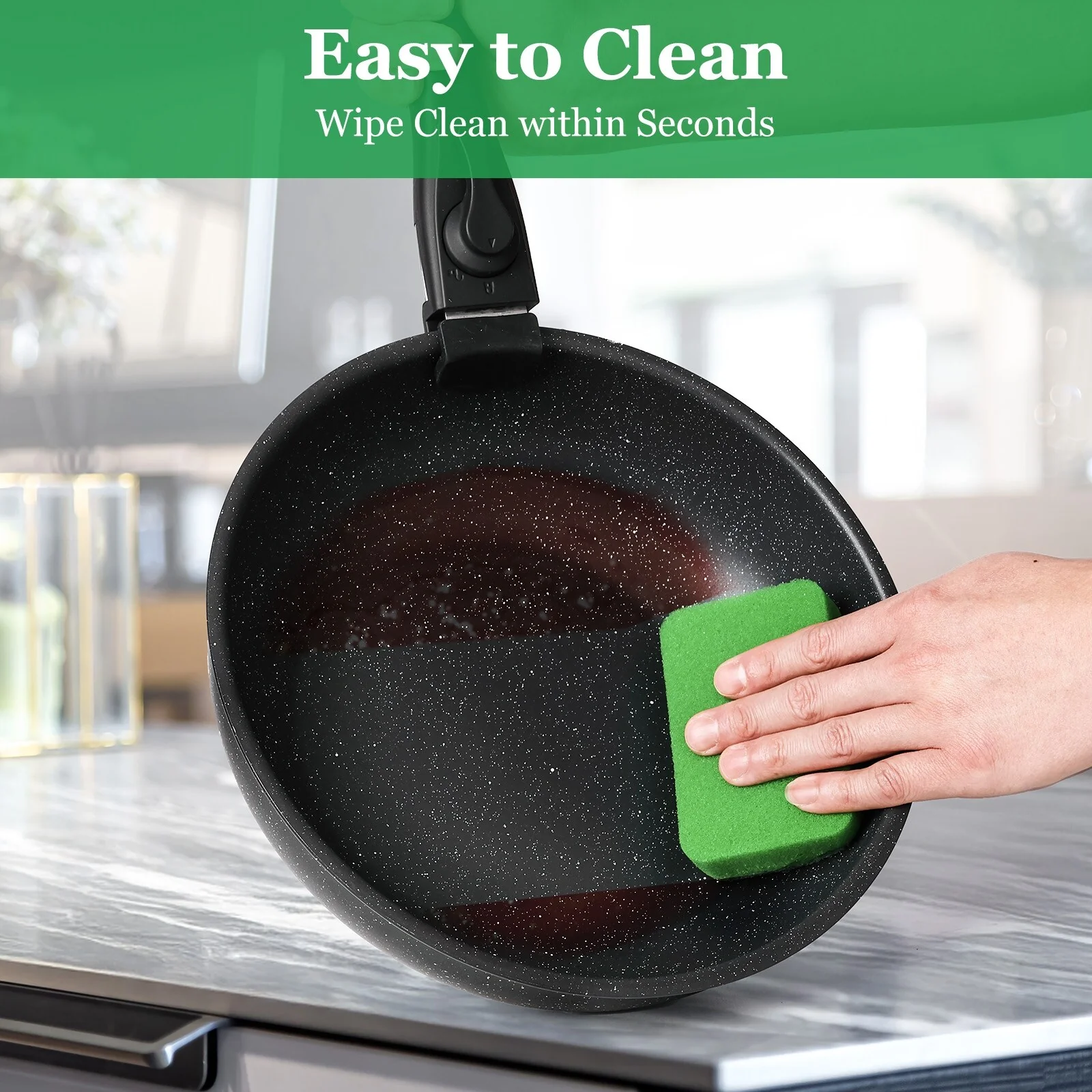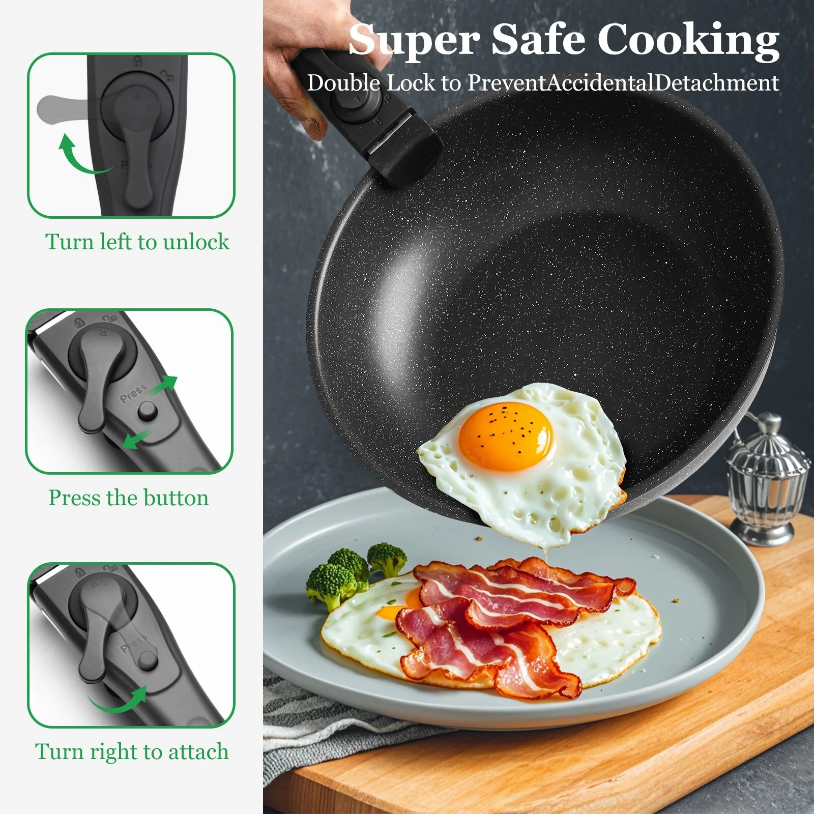 - 【Interchangeable Removable Handles】Designed for safety and convenience, the ergonomic removable handles fit all pots and pans in the set, providing a secure grip and preventing burns while cooking or storing.