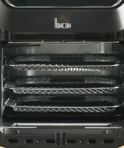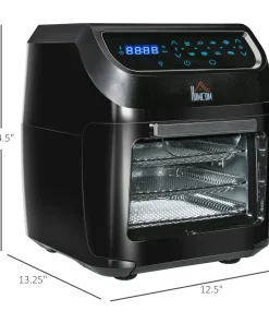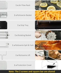 - Included Accessories: This compact air fryer features various tools to make different foods – 3 x Air Flow Rack, 1 x Rotisserie Basket, 1 x Drip Tray, 1 x Rotating Basket, 1 x Rotisserie Spit & Fork, 1 x Rotisserie Lift, 1 x Protection Cover. Overall Dimensions: 12.5" L x 13.25" W x 14.5" H.
