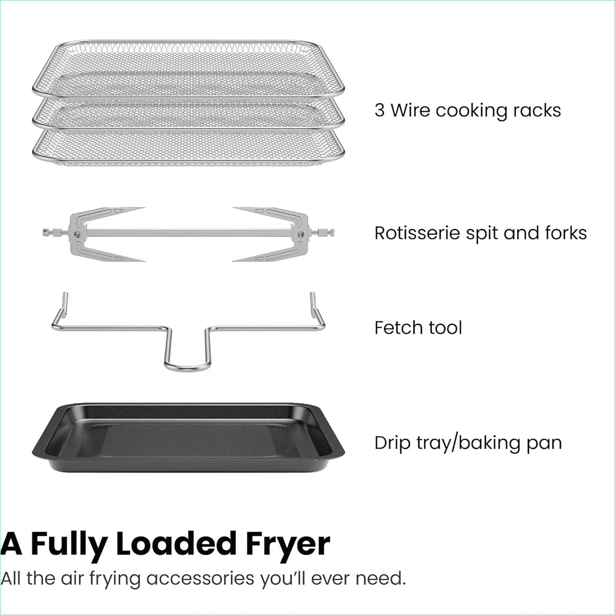 - ACCESSORIES INCLUDED: Includes three cooking racks, stainless-steel rotisserie oven spit and forks, a rotisserie retrieval tool, and a drip tray.