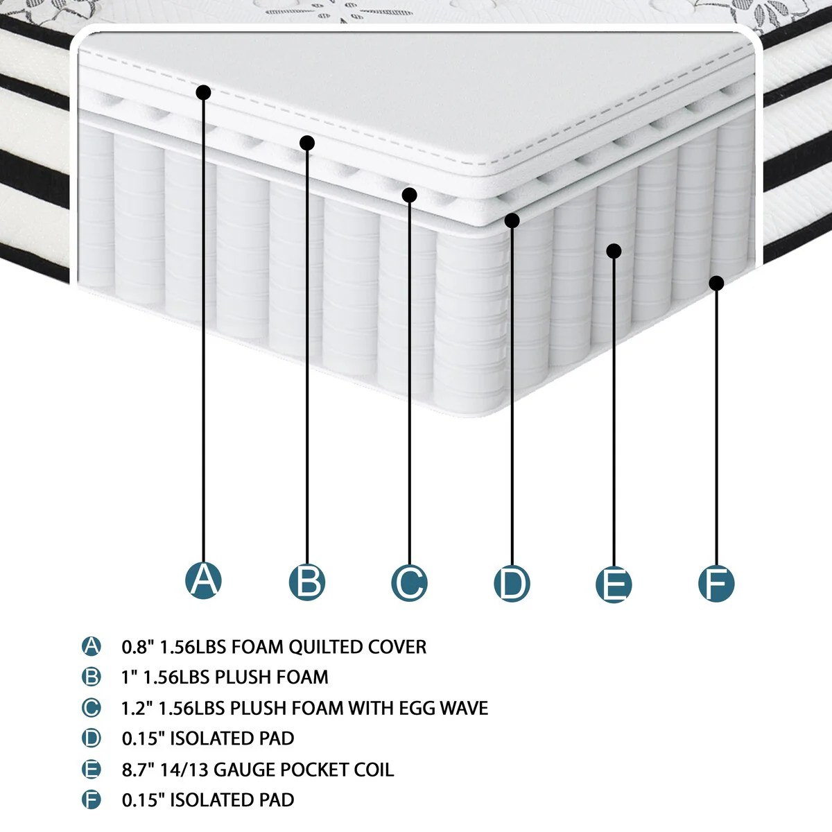 Our 12-inch mattress features a four-layer construction that consists of: 0.8-inch quilted cover which contains green tea extract for freshness, 1-inch of super soft foam, 1.2-inch of super soft convoluted foam, 8.7 –inch 14/13 gauge pocket coil unit and two 0.15-inch isolated pads.