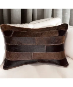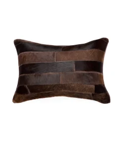 Unique and decorative, this comfortable 12-inch x 20-inch chocolate patchwork cowhide lumbar throw pillow will leave a lasting impression. This luxuriously soft pillow is expertly made of high grade, genuine cowhide in a chocolate coloration. Elegantly chic, this pillow is the epitome of luxury. Super soft and built to hold its shape, this polyfill-filled pillow is a great option. For anyone that loves to decorate or accent their space with color and texture. A great decorative accessory to add color and dimension to your favorite chair, accent your sofa, or to use as part of your bed ensemble. 12-inch h x 20-inch w x 5-inch d.