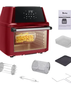 All-in-One Air Fryer, Oven, Rotisserie, and Dehydrator With the Large Air Fryer you are on your way to healthy eating without sacrificing on taste or flavor. Cook, fry, grill and bake without the need for butter, oil or other unhealthy fats. With Rotisserie Chicken Fork, it could cook 3kgs( 6pounds ) Chicken with crisp outside and juice inside. Each Deluxe Air Fryer Oven comes with a fry pan (drip tray), three fry net, chicken fork , rotating basket , skewer rack , fetch rack. Double layer window with inside glass and outside transperant PC. Power Lighting inside, give you a good vision and cool touch.