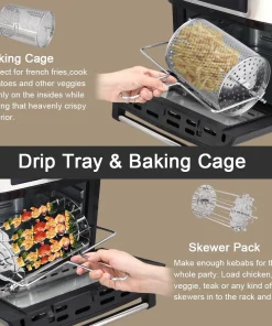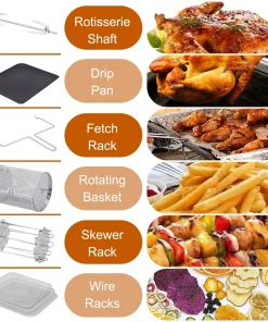 All-in-One Air Fryer, Oven, Rotisserie, and Dehydrator With the Large Air Fryer you are on your way to healthy eating without sacrificing on taste or flavor. Cook, fry, grill and bake without the need for butter, oil or other unhealthy fats. With Rotisserie Chicken Fork, it could cook 3kgs( 6pounds ) Chicken with crisp outside and juice inside. Each Deluxe Air Fryer Oven comes with a fry pan (drip tray), three fry net, chicken fork , rotating basket , skewer rack , fetch rack. Double layer window with inside glass and outside transperant PC. Power Lighting inside, give you a good vision and cool touch.Features:1. Extra Large Cooking Capacity , 16.91 quarts of cooking space makes this air fryer one of the largest on the market, while still being compact enough to fit easily on your counter top.With Rotisserie Chicken Fork, it could cook 3kgs( 6pounds ) Chicken with crisp outside and juice inside2. Digital easy one touch panel , 8 Preset Quick Menus , One Button Control : Internal lighting and Rotisserie. Dehydration function dehydrates foods such as fruit, veggies, and beef jerky, along with 3 Fry Net to cook multiple batches at once3. 8 Accessories allow you to do more than fry , one of the best parts about the Air Fryer Oven is its versatility. With the 8 included accessories, each Deluxe Air Fryer Oven comes with a Fry Pan (Drip Tray) , three Fry Net, Chicken Fork , Rotating Basket , Skewer Rack , Fetch Rack4. Large Visible Window with lighting, double Layer window with inside glass and outside transperant PC. Power Lighting inside, give you a good vision and Cool touchSpecifications:1. Color: Black2. Watt: 1800W3. Voltage: 120V/60Hz4. Timer: 24 Hours for Dehydrator,0-60Mins for Other Function5. Temperature Control: 80-200ºC/180-400ºF , Dehydrator:30-80ºC/90-170ºF6. Power Button: Yes7. Cooking Presets: 8 Cooking Presets9. Oven Capacity: 16.91Quarts / 16L 30CM(L)*26CM(D)*21CM(H)11. Certification: ETL Listed12. Dimensions: (15.08 x 14.96 x 15.24)" / (38.3 x 38 x 38.7)cm (L x W x H)13. Weight: 23.15lb / 10.5kg14. Brand: ZOKOPPackage Include:1 x Air Fryer Oven1 x The Oil Pan1 x Extraction Bracket1 x Shaft Turning Fork3 x Layer1 x Skewer Combination1 x Cage1 x Instruction