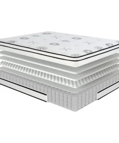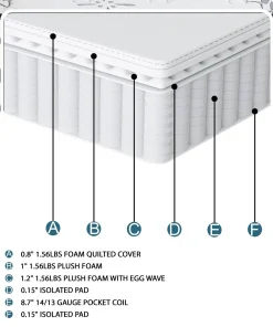 Our 12-inch mattress features a four-layer construction that consists of: 0.8-inch quilted cover which contains green tea extract for freshness, 1-inch of super soft foam, 1.2-inch of super soft convoluted foam, 8.7 –inch 14/13 gauge pocket coil unit and two 0.15-inch isolated pads.