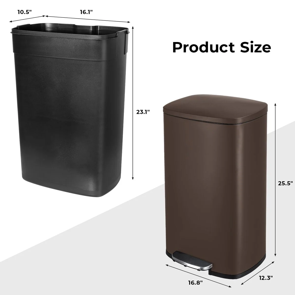 【30L/50L LARGE CAPACITY】Size is 13.4*9.3*24.6(L*W*H) /16.8*12.3*25.5(L*W*H)inches, and the large capacity of 30/50 Liter provides you with enough garbage storage space, saving you the time of frequent garbage disposal. Suitable for large families and offices, it provides more convenient services for your life.