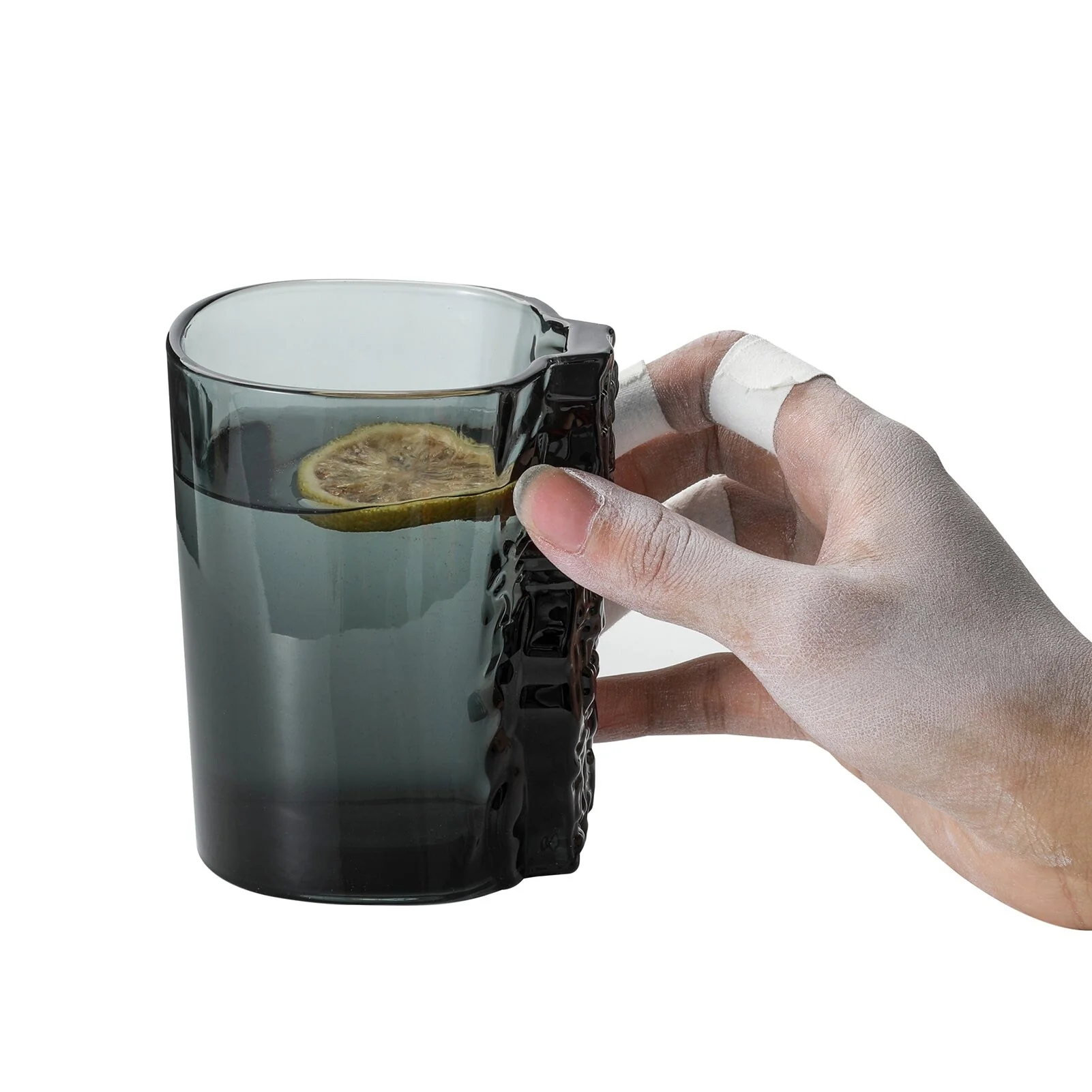 Crafted from solid color glass with a bold sculptural design, this distinctive 13.3 oz mug redefines your drinking experience with a crimp pinch grip instead of a traditional handle—offering a textured rock-like surface inspired by climbing holds. Designed to challenge your grip and engage your fingers, this mug weighs 1.25 lbs when empty and up to 1.9 lbs when filled, offering a unique tactile experience for those who appreciate functional artistry with a rugged twist. Measuring 3.75" x 3.15" x 6.5" H, this dishwasher-safe glass mug comes in striking color options like crystal clear, amber, and smoke grey. Whether you’re sipping a hot morning brew or serving up a cold beverage, this sculpted pinch-grip mug adds a bold, conversation-starting element to your drinkware collection.