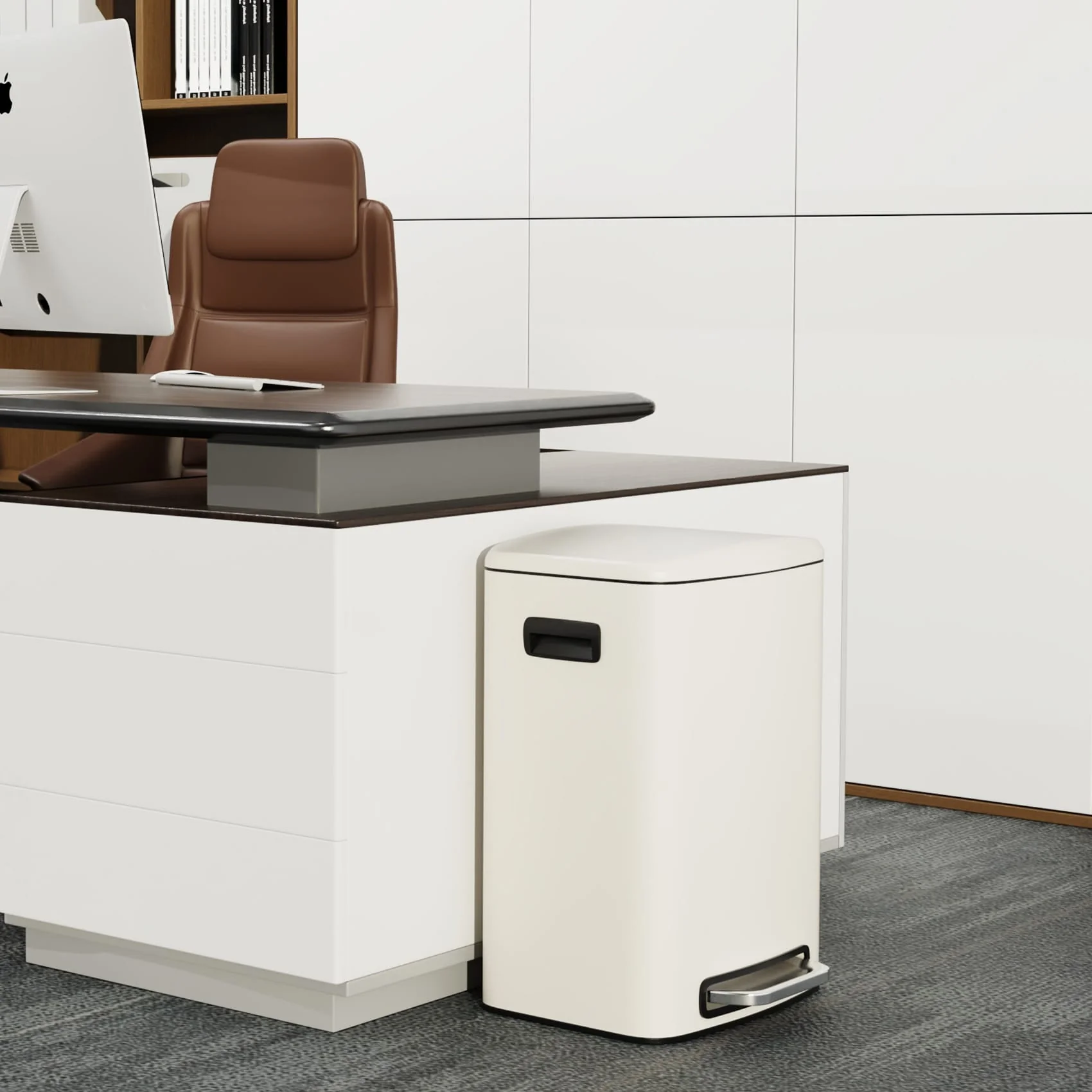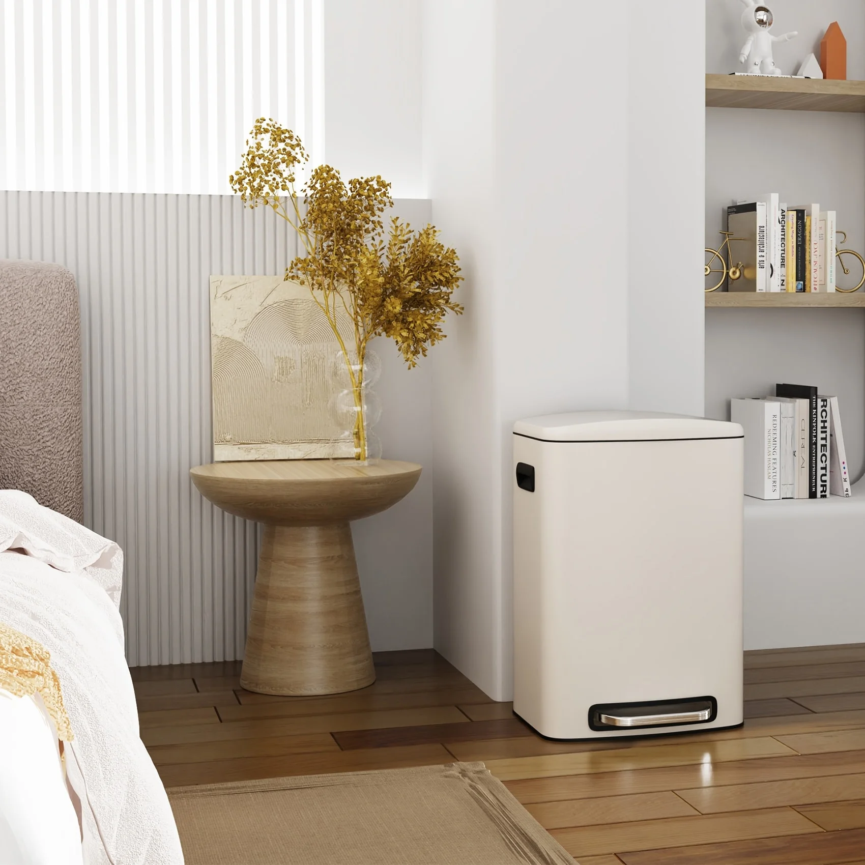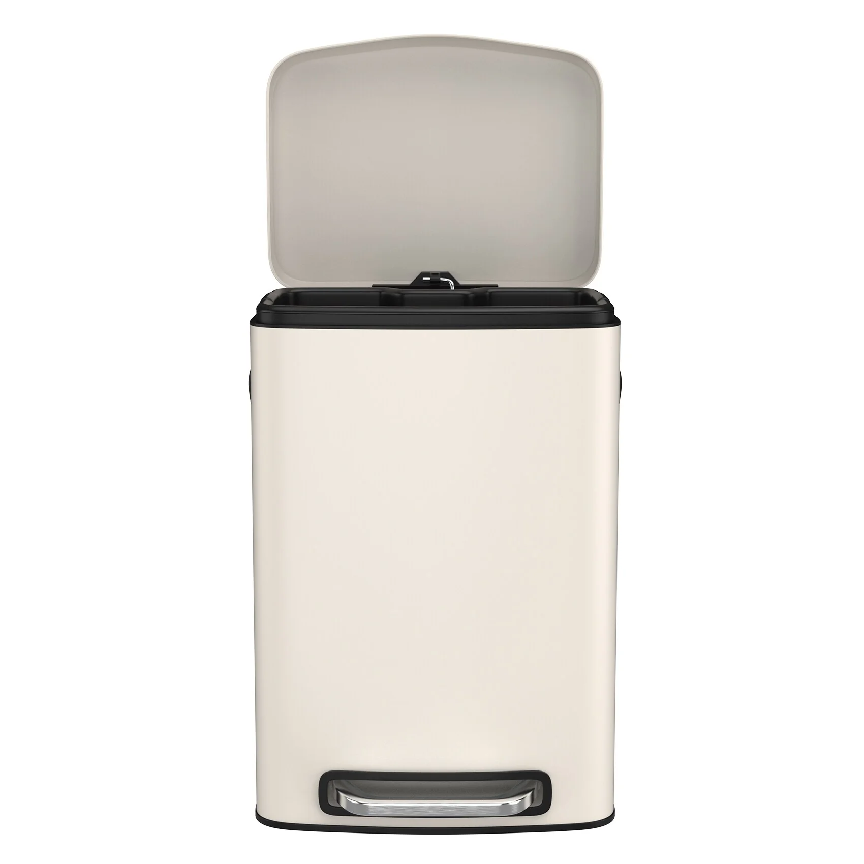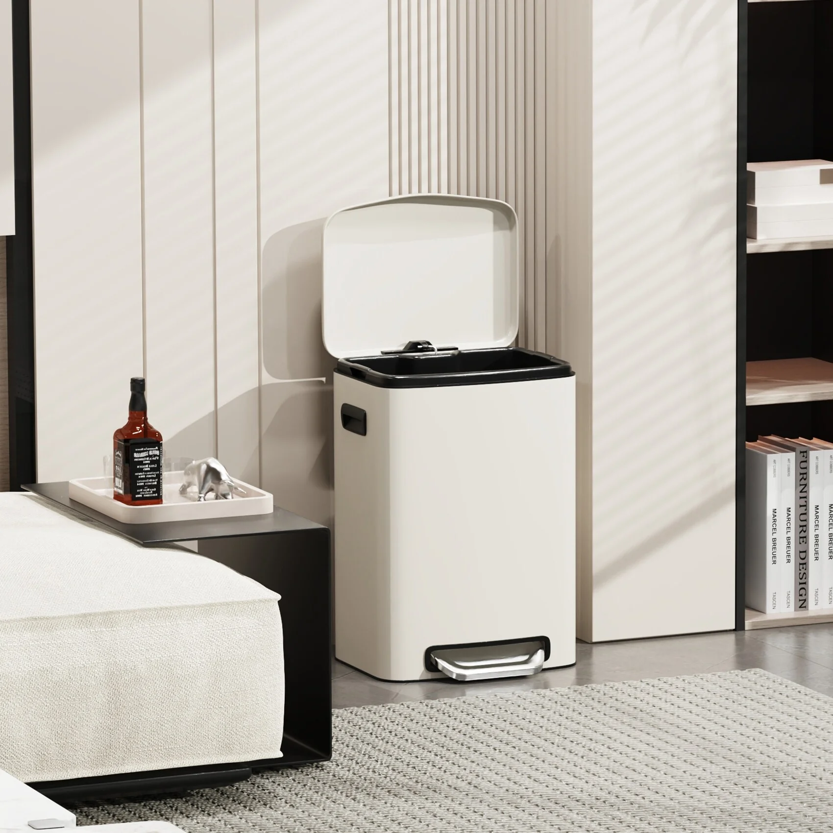 [STEP TRASH CAN] – Rectangular stainless steel trash can with manual foot lever. Fingerprint-proof, smudge resistant, and durable stainless steel exterior. Heavy-duty plastic interior bucket can be easily removed for convenient waste disposal. Removable plastic liner and stay open lid lock make bag changes and cleaning easy.