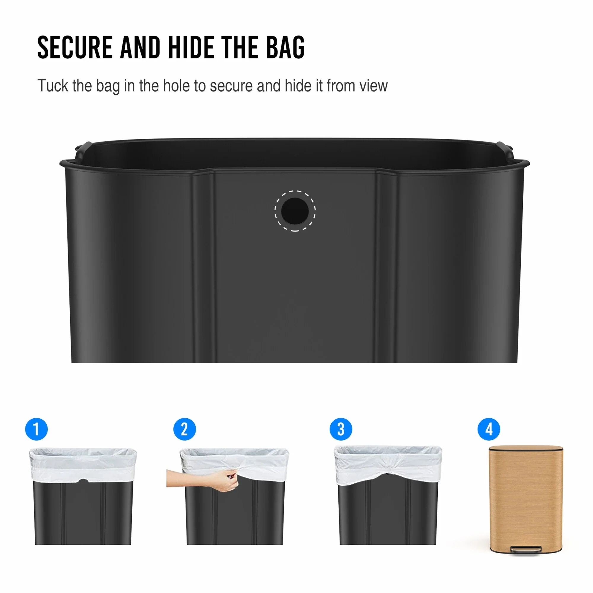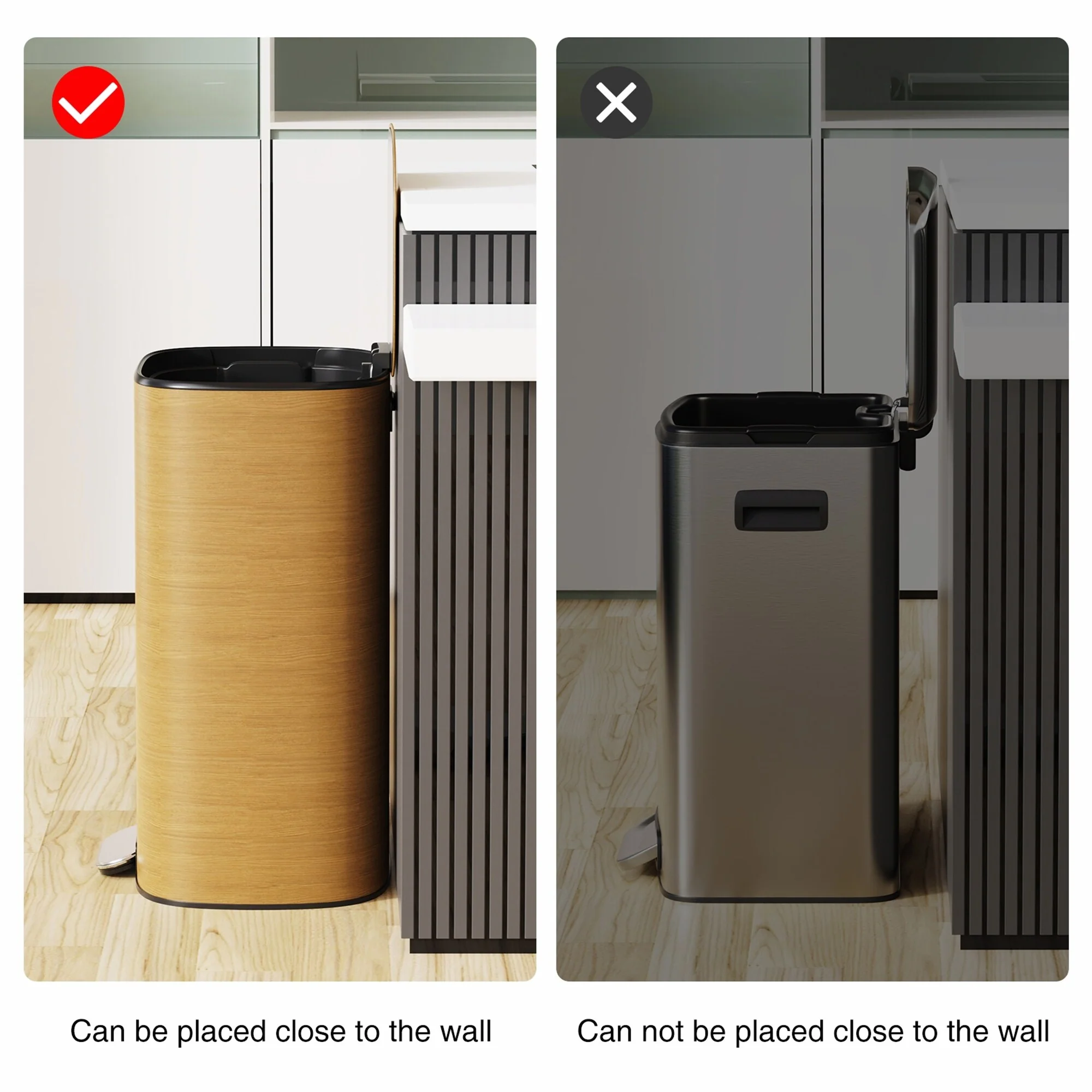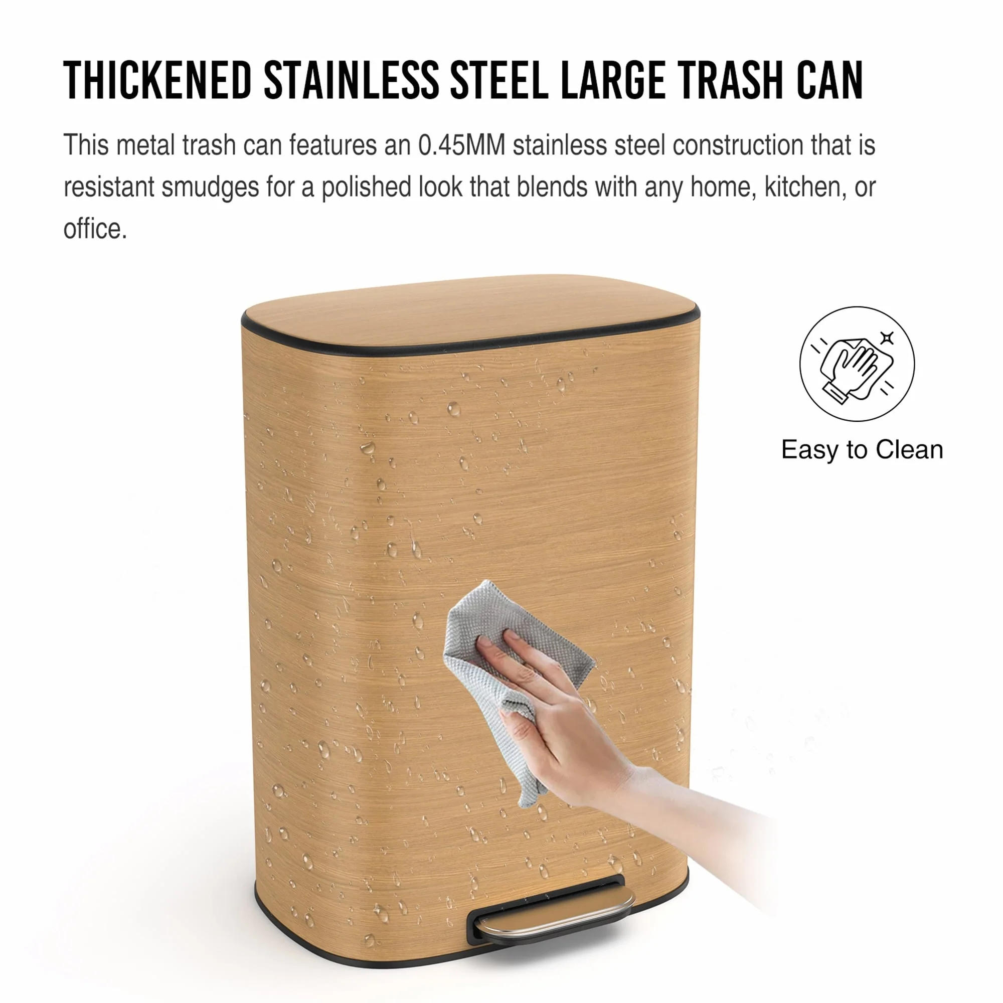 【Product Features】★13.2 gallon/50 liter. The huge capacity definitely meets your daily use, this can fits most brands of 13 gallon trash bags. It can be a good helper for your kitchen and make your room clean and tidy. The sophisticated rectangular appearance also makes it suitable for a variety of occasions. It makes a shining impression from the outside.★Lid features a stay-open mode to easily remove and replace garbage bags and dispose waste. Soft-close lid reduces noise from opening/closing and extends product life span. The lid closes with hardly any sound, if the person next to you is taking a nap, there is no need to worry about disturbing them with this bin.★Rectangular stainless steel trash can with manual foot lever. Fingerprint-proof, smudge resistant, and durable stainless steel exterior. Heavy-duty plastic interior bucket can be easily removed for convenient waste disposal. Removable plastic liner and stay open lid lock make bag changes and cleaning easy.★High quality all stainless-steel thickened trash can body by 0.45MM stainless steel material production. Compared to most 0.3MM materials trash can on the market, our stainless steel trash can are less prone to deformation and are stronger in use! High-quality 410 stainless steel and ABS construted, our trashcan is build to last!【Keep it looking its best】1.Fabric furniture Care;Dust regularly. Clean gently with a clean, slightly damp cloth. Professional cleaning is recommended.2.Wood Furniture Care:We recommend dusting frequently with a clean, soft, dry, lint-free cloth. Clean the surface by rubbing in the direction of the grain and wipe dry.3.Avoid direct sunlight.4.Avoid the use of all chemicals, household cleaners, abrasives, or cleaners that contain lemon, vinegar, or other acids that may damage the finish.5.Do not place hot appliances, such as curling irons and hot hair dryers directly on the countertop.6.Spot clean using distilled water and water-based cleaning agents, foam or mild water-free cleaning solvents. 7.Always test a small inconspicuous area first.8.Hardware may loosen over time; periodically check to make sure all connections are tight【Notes】1.Size Notice:Manual measurement has been used, there may be some reasonable errort, thanks for your understanding.2.Color Notice:Due to factors such as display equipment and shooting environment, the color of the item may be slightly different from the picture, which is a normal phenomenon, please refer to the actual item3.Assembly Notice:Please read assemble manual in advance. Please do not over-tighten nuts, as this may cause distortion or breakage.4.It is recommended to put a layer of foam or soft cushion on the floor when installing to avoid scratching the floor.5.If the item has any defects, damage or missing parts, please contact us with pictures or videos so that we can understand your needs and help you quickly, and always remember to retain its original packaging to ensure any return requests. We will try our best to solve any problems you may have.6.If you receive the wrong product, please attach the product picture, the infographic of the outer package and the picture containing SKUs, so that we can verify and quickly deal with it for you