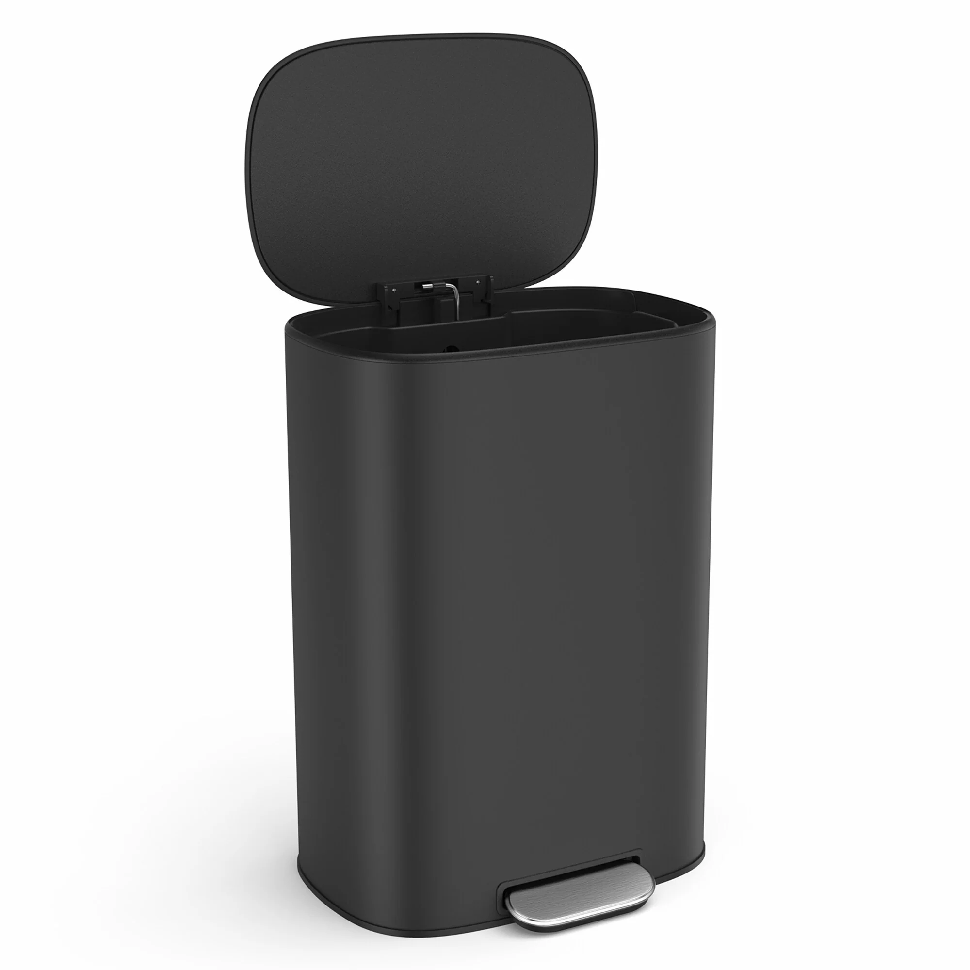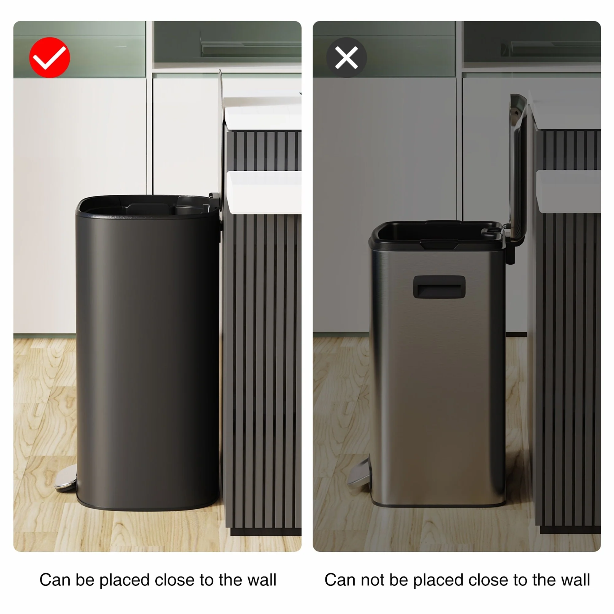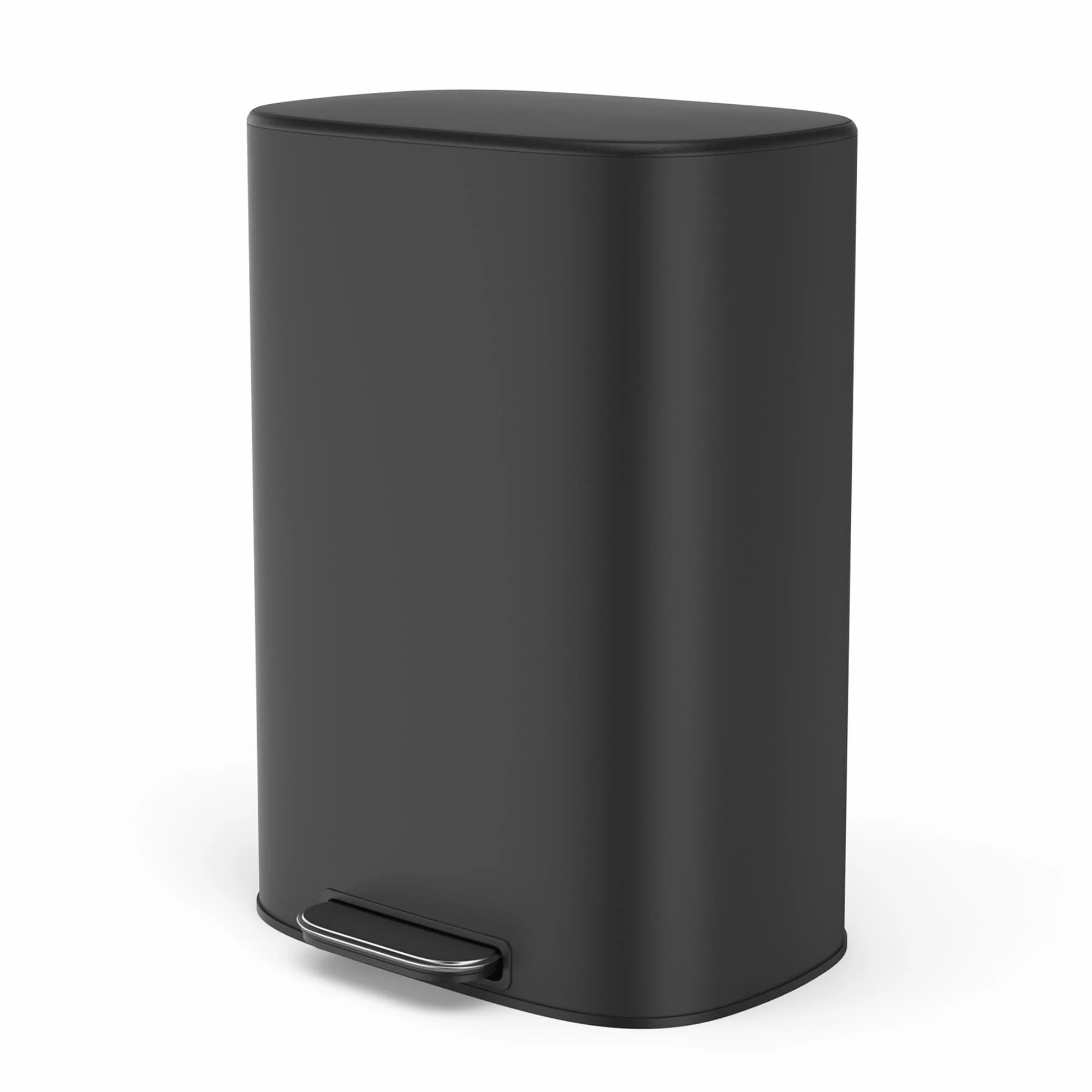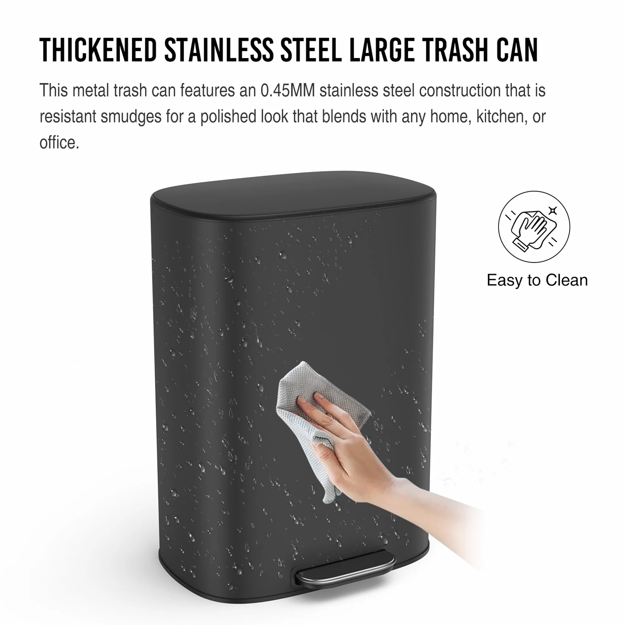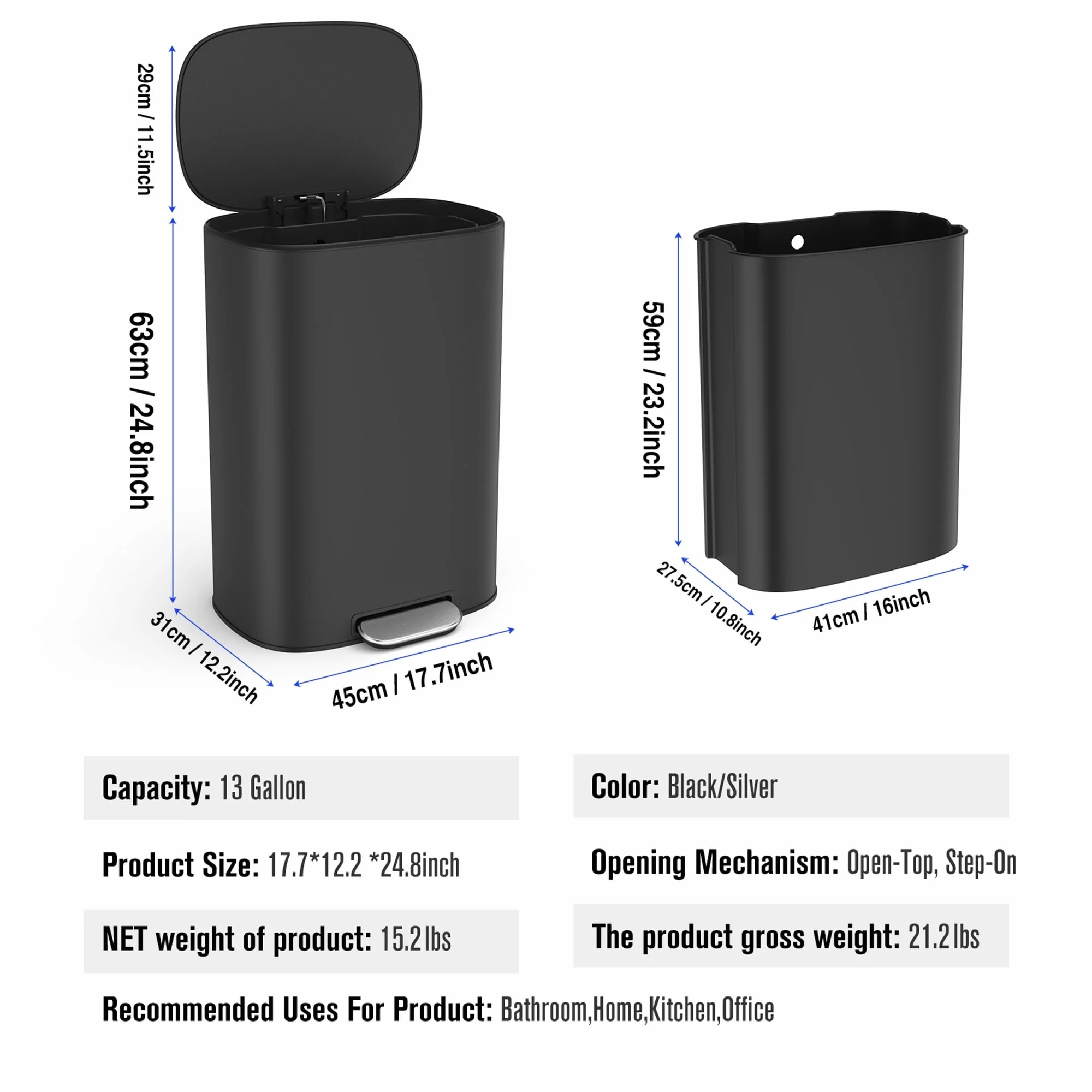 【Product Features】★[LARGE CAPACITY TRASH CAN] – 13.2 gallon/50 liter. The huge capacity definitely meets your daily use, this can fits most brands of 13 gallon trash bags. It can be a good helper for your kitchen and make your room clean and tidy. The sophisticated rectangular appearance also makes it suitable for a variety of occasions. It makes a shining impression from the outside.★[SOFT CLOSE MUTE LID] – Lid features a stay-open mode to easily remove and replace garbage bags and dispose waste. Soft-close lid reduces noise from opening/closing and extends product life span. The lid closes with hardly any sound, if the person next to you is taking a nap, there is no need to worry about disturbing them with this bin.★[STEP TRASH CAN] – Rectangular stainless steel trash can with manual foot lever. Fingerprint-proof, smudge resistant, and durable stainless steel exterior. Heavy-duty plastic interior bucket can be easily removed for convenient waste disposal. Removable plastic liner and stay open lid lock make bag changes and cleaning easy.★[THICKENED STAINLESS STEEL GARBAGE CAN] – High quality all stainless-steel thickened trash can body by 0.45MM stainless steel material production. Compared to most 0.3MM materials trash can on the market, our stainless steel trash can are less prone to deformation and are stronger in use! High-quality 410 stainless steel and ABS construted, our trashcan is build to last!【Keep it looking its best】1.Fabric furniture Care;Dust regularly. Clean gently with a clean, slightly damp cloth. Professional cleaning is recommended.2.Wood Furniture Care:We recommend dusting frequently with a clean, soft, dry, lint-free cloth. Clean the surface by rubbing in the direction of the grain and wipe dry.3.Avoid direct sunlight.4.Avoid the use of all chemicals, household cleaners, abrasives, or cleaners that contain lemon, vinegar, or other acids that may damage the finish.5.Do not place hot appliances, such as curling irons and hot hair dryers directly on the countertop.6.Spot clean using distilled water and water-based cleaning agents, foam or mild water-free cleaning solvents. 7.Always test a small inconspicuous area first.8.Hardware may loosen over time; periodically check to make sure all connections are tight【Notes】1.Size Notice:Manual measurement has been used, there may be some reasonable errort, thanks for your understanding.2.Color Notice:Due to factors such as display equipment and shooting environment, the color of the item may be slightly different from the picture, which is a normal phenomenon, please refer to the actual item3.Assembly Notice:Please read assemble manual in advance. Please do not over-tighten nuts, as this may cause distortion or breakage.4.It is recommended to put a layer of foam or soft cushion on the floor when installing to avoid scratching the floor.5.If the item has any defects, damage or missing parts, please contact us with pictures or videos so that we can understand your needs and help you quickly, and always remember to retain its original packaging to ensure any return requests. We will try our best to solve any problems you may have.6.If you receive the wrong product, please attach the product picture, the infographic of the outer package and the picture containing SKUs, so that we can verify and quickly deal with it for you