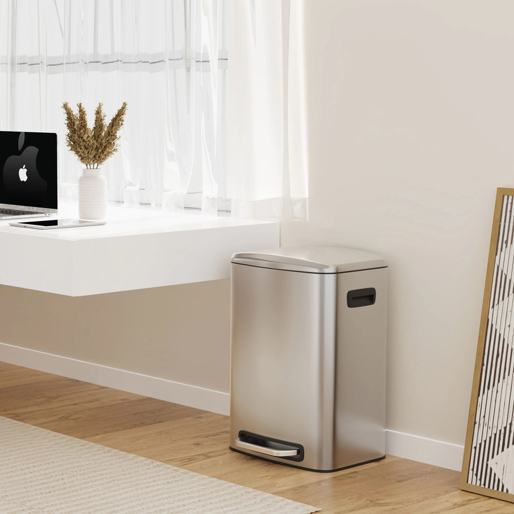 【Product Features】★[LARGE CAPACITY TRASH CAN] – 16.81”L×15.27”W×23.46”H, 13.2 gallon/50 liter. The huge capacity definitely meets your daily use, this can fits most brands of 13 gallon trash bags. It can be a good helper for your kitchen and make your room clean and tidy. The sophisticated rectangular appearance also makes it suitable for a variety of occasions. It makes a shining impression from the outside.★[SOFT CLOSE MUTE LID] – Lid features a stay-open mode to easily remove and replace garbage bags and dispose waste. Soft-close lid reduces noise from opening/closing and extends product life span. The lid closes with hardly any sound, if the person next to you is taking a nap, there is no need to worry about disturbing them with this bin.★[STEP TRASH CAN] – Rectangular stainless steel trash can with manual foot lever. Fingerprint-proof, smudge resistant, and durable stainless steel exterior. Heavy-duty plastic interior bucket can be easily removed for convenient waste disposal. Removable plastic liner and stay open lid lock make bag changes and cleaning easy.★[THICKENED STAINLESS STEEL GARBAGE CAN] – High quality all stainless-steel thickened trash can body by 0.45MM stainless steel material production. Compared to most 0.3MM materials trash can on the market, our stainless steel trash can are less prone to deformation and are stronger in use! High-quality 410 stainless steel and ABS construted, our trashcan is build to last!【Keep it looking its best】1.Fabric furniture Care;Dust regularly. Clean gently with a clean, slightly damp cloth. Professional cleaning is recommended.2.Wood Furniture Care:We recommend dusting frequently with a clean, soft, dry, lint-free cloth. Clean the surface by rubbing in the direction of the grain and wipe dry.3.Avoid direct sunlight.4.Avoid the use of all chemicals, household cleaners, abrasives, or cleaners that contain lemon, vinegar, or other acids that may damage the finish.5.Do not place hot appliances, such as curling irons and hot hair dryers directly on the countertop.6.Spot clean using distilled water and water-based cleaning agents, foam or mild water-free cleaning solvents. 7.Always test a small inconspicuous area first.8.Hardware may loosen over time; periodically check to make sure all connections are tight【Notes】1.Size Notice:Manual measurement has been used, there may be some reasonable errort, thanks for your understanding.2.Color Notice:Due to factors such as display equipment and shooting environment, the color of the item may be slightly different from the picture, which is a normal phenomenon, please refer to the actual item3.Assembly Notice:Please read assemble manual in advance. Please do not over-tighten nuts, as this may cause distortion or breakage.4.It is recommended to put a layer of foam or soft cushion on the floor when installing to avoid scratching the floor.5.If the item has any defects, damage or missing parts, please contact us with pictures or videos so that we can understand your needs and help you quickly, and always remember to retain its original packaging to ensure any return requests. We will try our best to solve any problems you may have.6.If you receive the wrong product, please attach the product picture, the infographic of the outer package and the picture containing SKUs, so that we can verify and quickly deal with it for you