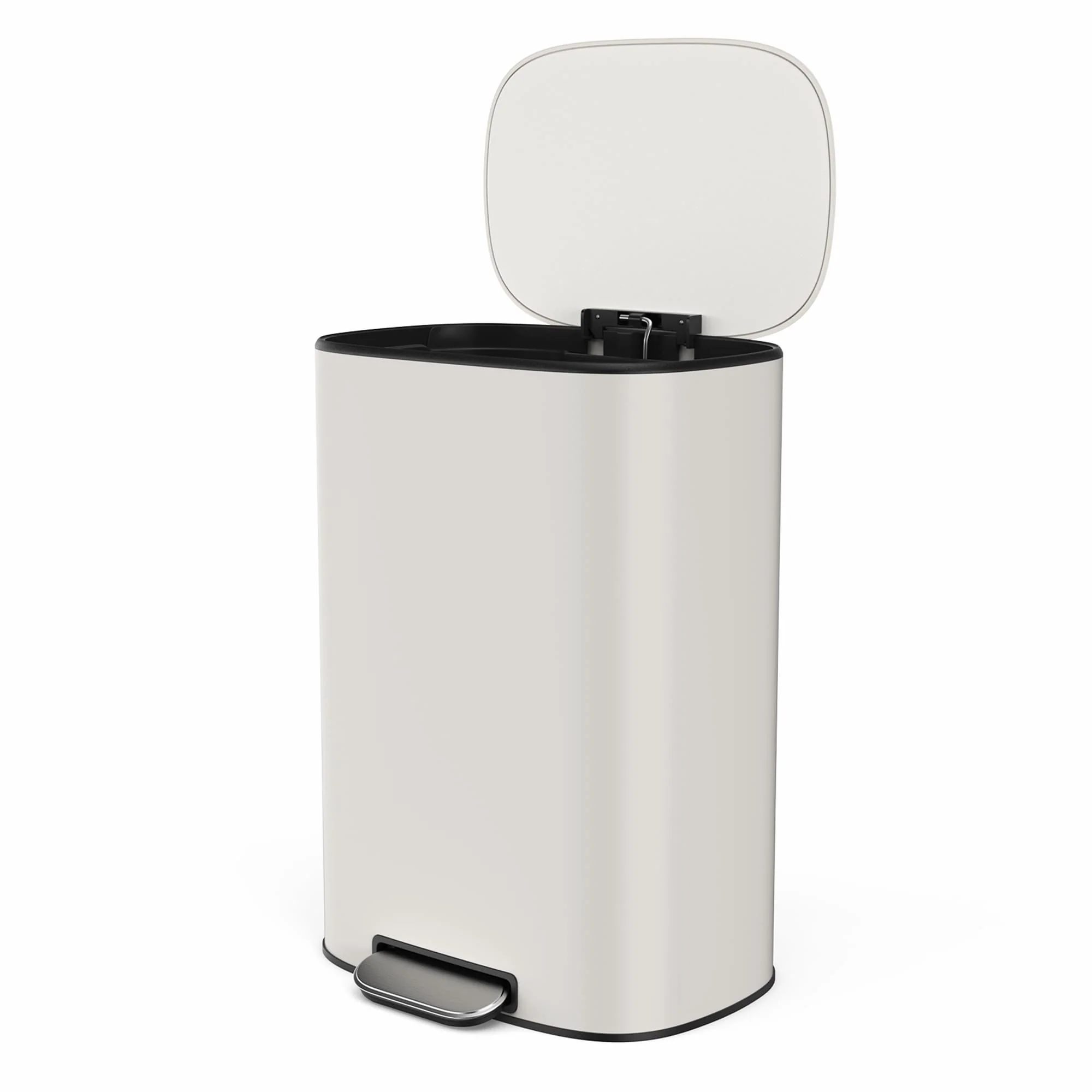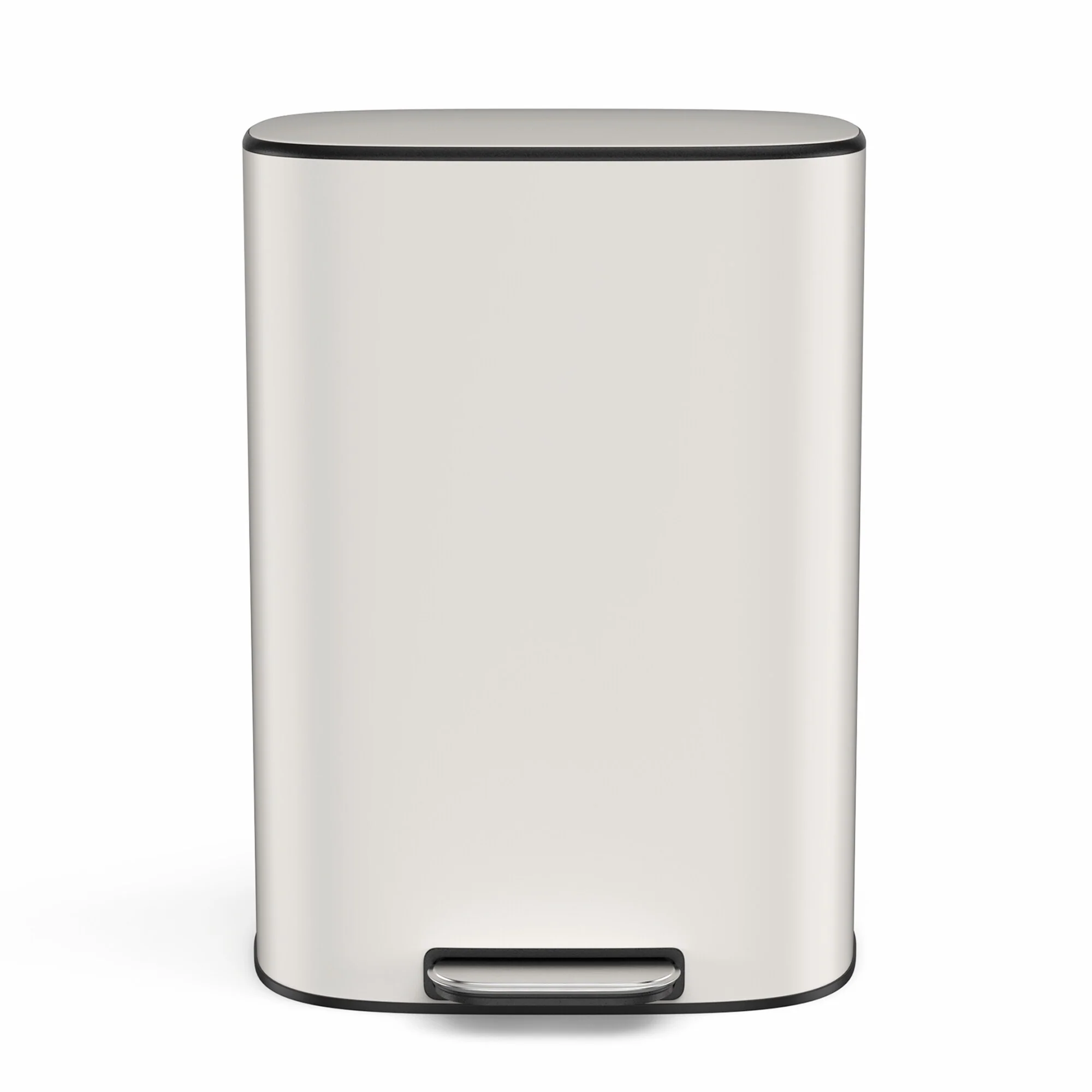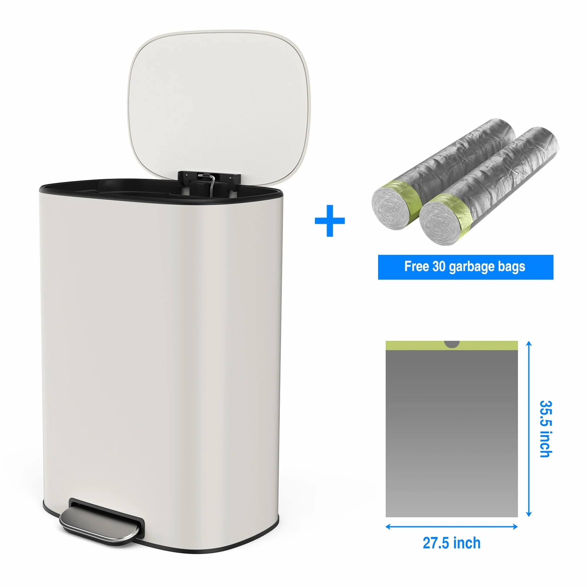 【Product Features】★13.2 gallon/50 liter. The huge capacity definitely meets your daily use, this can fits most brands of 13 gallon trash bags. It can be a good helper for your kitchen and make your room clean and tidy. The sophisticated rectangular appearance also makes it suitable for a variety of occasions. It makes a shining impression from the outside.★Lid features a stay-open mode to easily remove and replace garbage bags and dispose waste. Soft-close lid reduces noise from opening/closing and extends product life span. The lid closes with hardly any sound, if the person next to you is taking a nap, there is no need to worry about disturbing them with this bin.★Rectangular stainless steel trash can with manual foot lever. Fingerprint-proof, smudge resistant, and durable stainless steel exterior. Heavy-duty plastic interior bucket can be easily removed for convenient waste disposal. Removable plastic liner and stay open lid lock make bag changes and cleaning easy.★High quality all stainless-steel thickened trash can body by 0.45MM stainless steel material production. Compared to most 0.3MM materials trash can on the market, our stainless steel trash can are less prone to deformation and are stronger in use! High-quality 410 stainless steel and ABS construted, our trashcan is build to last!【Keep it looking its best】1.Fabric furniture Care;Dust regularly. Clean gently with a clean, slightly damp cloth. Professional cleaning is recommended.2.Wood Furniture Care:We recommend dusting frequently with a clean, soft, dry, lint-free cloth. Clean the surface by rubbing in the direction of the grain and wipe dry.3.Avoid direct sunlight.4.Avoid the use of all chemicals, household cleaners, abrasives, or cleaners that contain lemon, vinegar, or other acids that may damage the finish.5.Do not place hot appliances, such as curling irons and hot hair dryers directly on the countertop.6.Spot clean using distilled water and water-based cleaning agents, foam or mild water-free cleaning solvents. 7.Always test a small inconspicuous area first.8.Hardware may loosen over time; periodically check to make sure all connections are tight【Notes】1.Size Notice:Manual measurement has been used, there may be some reasonable errort, thanks for your understanding.2.Color Notice:Due to factors such as display equipment and shooting environment, the color of the item may be slightly different from the picture, which is a normal phenomenon, please refer to the actual item3.Assembly Notice:Please read assemble manual in advance. Please do not over-tighten nuts, as this may cause distortion or breakage.4.It is recommended to put a layer of foam or soft cushion on the floor when installing to avoid scratching the floor.5.If the item has any defects, damage or missing parts, please contact us with pictures or videos so that we can understand your needs and help you quickly, and always remember to retain its original packaging to ensure any return requests. We will try our best to solve any problems you may have.6.If you receive the wrong product, please attach the product picture, the infographic of the outer package and the picture containing SKUs, so that we can verify and quickly deal with it for you