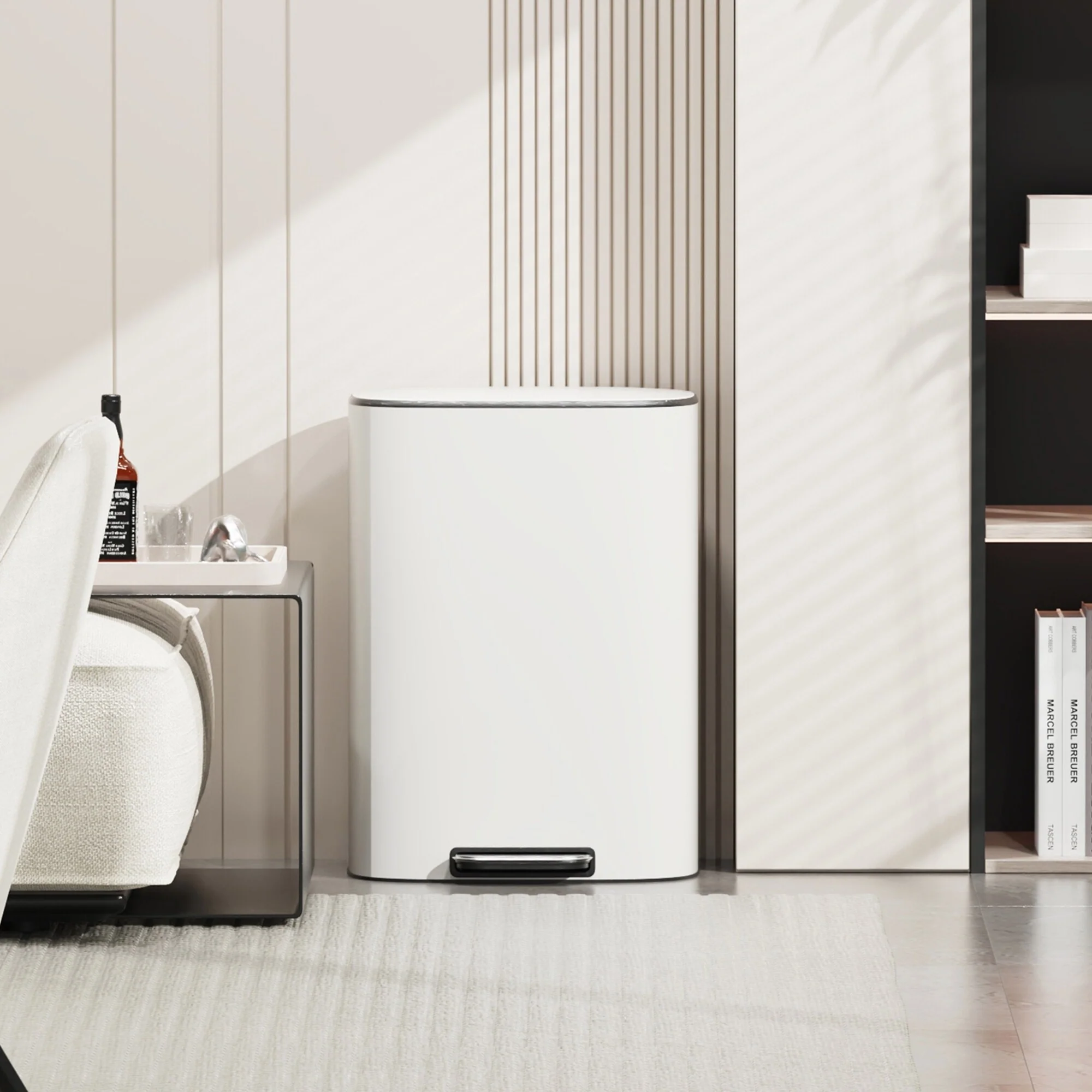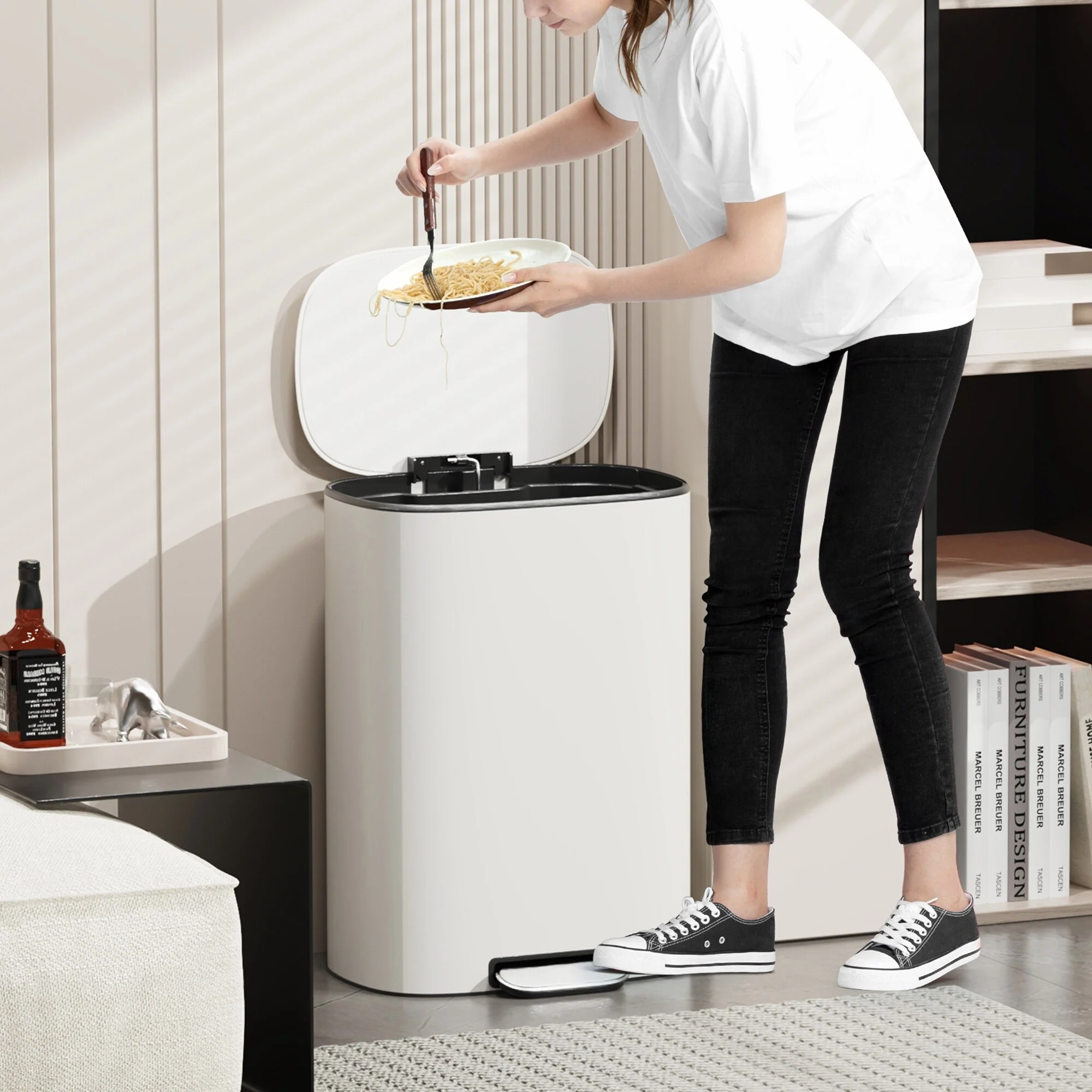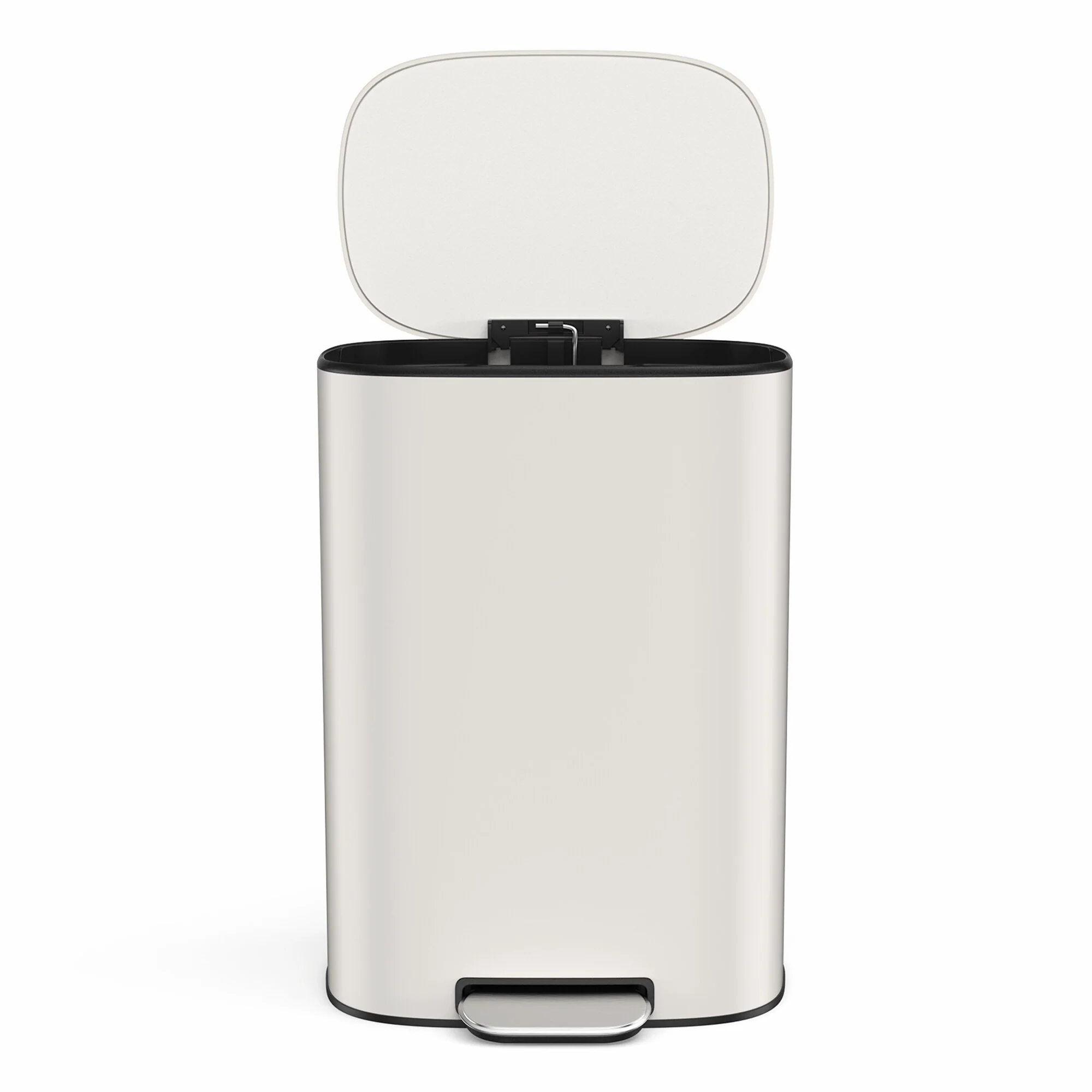 【Product Features】★13.2 gallon/50 liter. The huge capacity definitely meets your daily use, this can fits most brands of 13 gallon trash bags. It can be a good helper for your kitchen and make your room clean and tidy. The sophisticated rectangular appearance also makes it suitable for a variety of occasions. It makes a shining impression from the outside.★Lid features a stay-open mode to easily remove and replace garbage bags and dispose waste. Soft-close lid reduces noise from opening/closing and extends product life span. The lid closes with hardly any sound, if the person next to you is taking a nap, there is no need to worry about disturbing them with this bin.★Rectangular stainless steel trash can with manual foot lever. Fingerprint-proof, smudge resistant, and durable stainless steel exterior. Heavy-duty plastic interior bucket can be easily removed for convenient waste disposal. Removable plastic liner and stay open lid lock make bag changes and cleaning easy.★High quality all stainless-steel thickened trash can body by 0.45MM stainless steel material production. Compared to most 0.3MM materials trash can on the market, our stainless steel trash can are less prone to deformation and are stronger in use! High-quality 410 stainless steel and ABS construted, our trashcan is build to last!【Keep it looking its best】1.Fabric furniture Care;Dust regularly. Clean gently with a clean, slightly damp cloth. Professional cleaning is recommended.2.Wood Furniture Care:We recommend dusting frequently with a clean, soft, dry, lint-free cloth. Clean the surface by rubbing in the direction of the grain and wipe dry.3.Avoid direct sunlight.4.Avoid the use of all chemicals, household cleaners, abrasives, or cleaners that contain lemon, vinegar, or other acids that may damage the finish.5.Do not place hot appliances, such as curling irons and hot hair dryers directly on the countertop.6.Spot clean using distilled water and water-based cleaning agents, foam or mild water-free cleaning solvents. 7.Always test a small inconspicuous area first.8.Hardware may loosen over time; periodically check to make sure all connections are tight【Notes】1.Size Notice:Manual measurement has been used, there may be some reasonable errort, thanks for your understanding.2.Color Notice:Due to factors such as display equipment and shooting environment, the color of the item may be slightly different from the picture, which is a normal phenomenon, please refer to the actual item3.Assembly Notice:Please read assemble manual in advance. Please do not over-tighten nuts, as this may cause distortion or breakage.4.It is recommended to put a layer of foam or soft cushion on the floor when installing to avoid scratching the floor.5.If the item has any defects, damage or missing parts, please contact us with pictures or videos so that we can understand your needs and help you quickly, and always remember to retain its original packaging to ensure any return requests. We will try our best to solve any problems you may have.6.If you receive the wrong product, please attach the product picture, the infographic of the outer package and the picture containing SKUs, so that we can verify and quickly deal with it for you