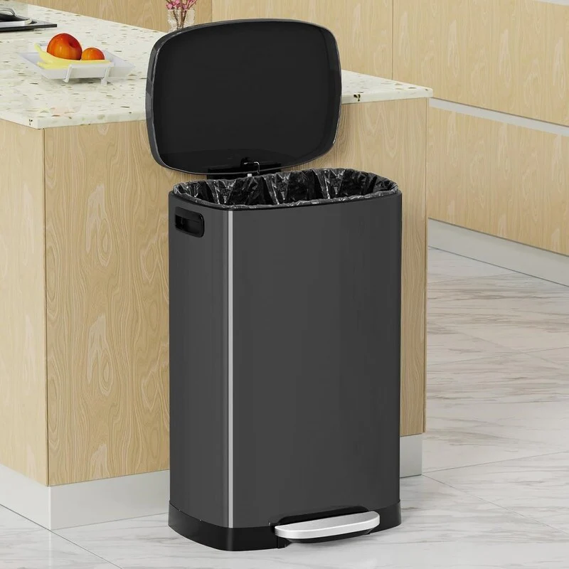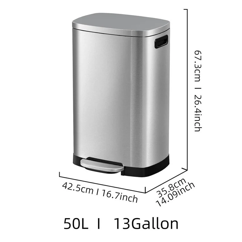 【High Quality Construction】13 Gallon Garbage can made of sturdy stainless steel with brushed surface, anti-fingerprints and easy to clean. ABS handle and base, anti-slip design.Pedal tested 200,000 times, service life over 25 years.