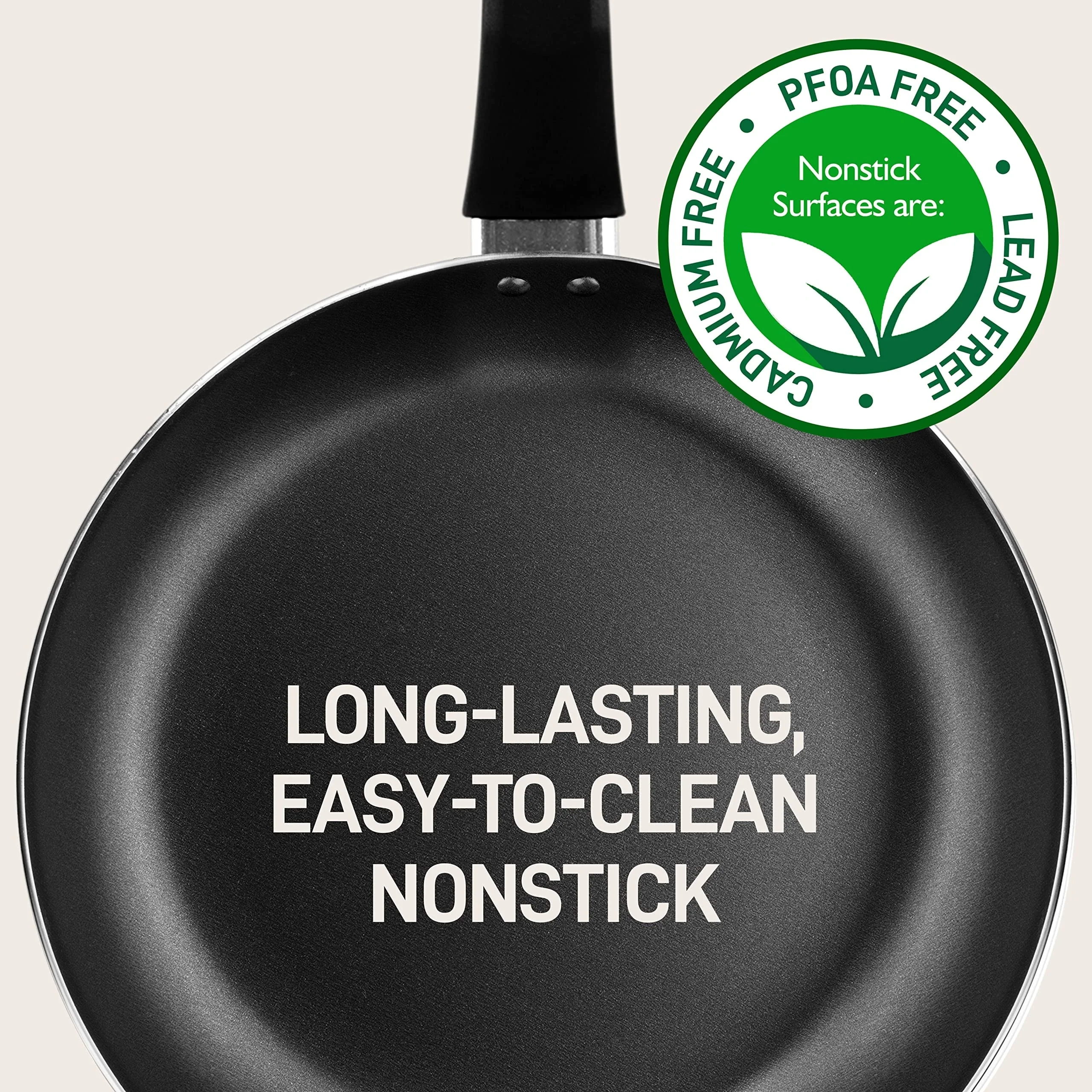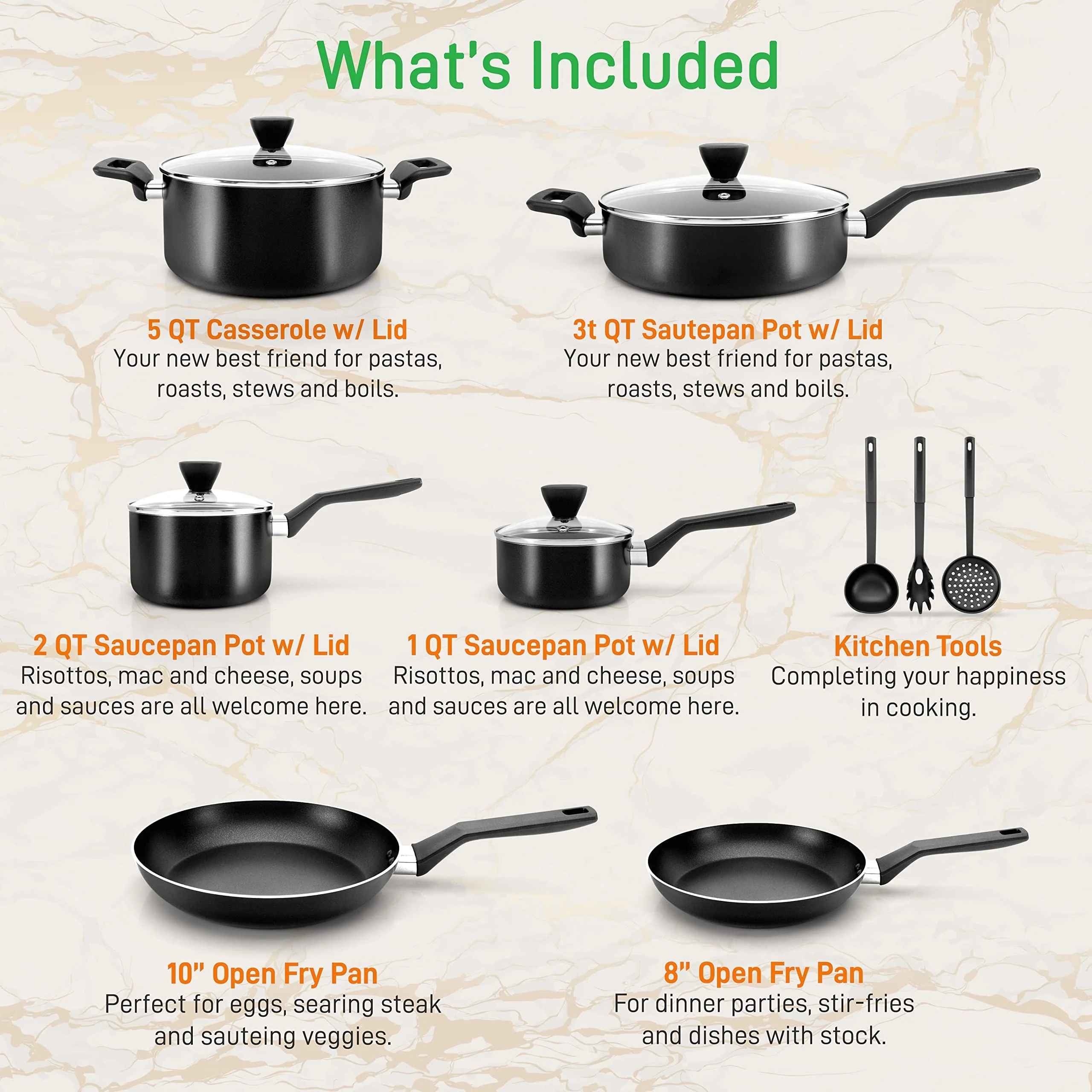 13-PIECE SET: offers a 13-piece nonstick cookware set which includes 1 and 2 quarts saucepan pots with lids, 5 quart casserole with lid, 3 quart saute pan pot w/ lid, 8-inch and 10-inch open fry pan, soup ladle, pasta fork, and strainer