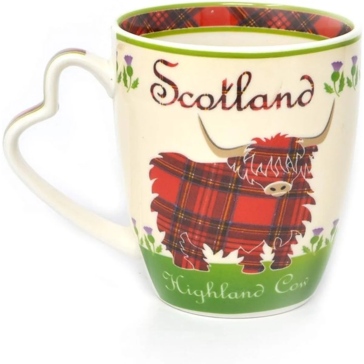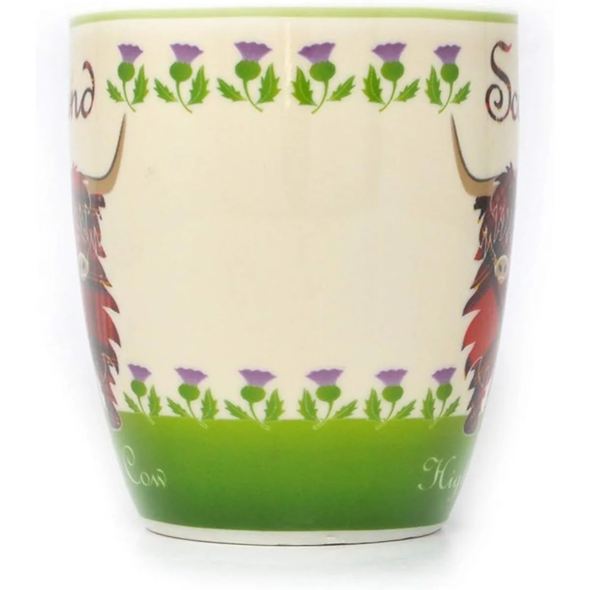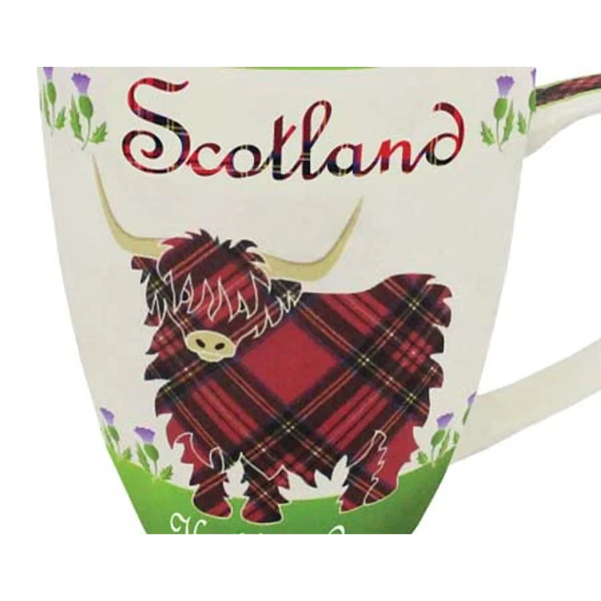 - This lovely scottish mug is printed with a lovely Scottish Highland Cow design featuring a graphic Highland Cow in rich red, yellow, and black traditional Scottish tartan set on a green field with Scottish thistles adorning the background and sky. The Highland Cow is the oldest registered breed in the world and is known for its thick, oiled coat to protect it from the elements and long horns that help it forage for food in the snowy winters.