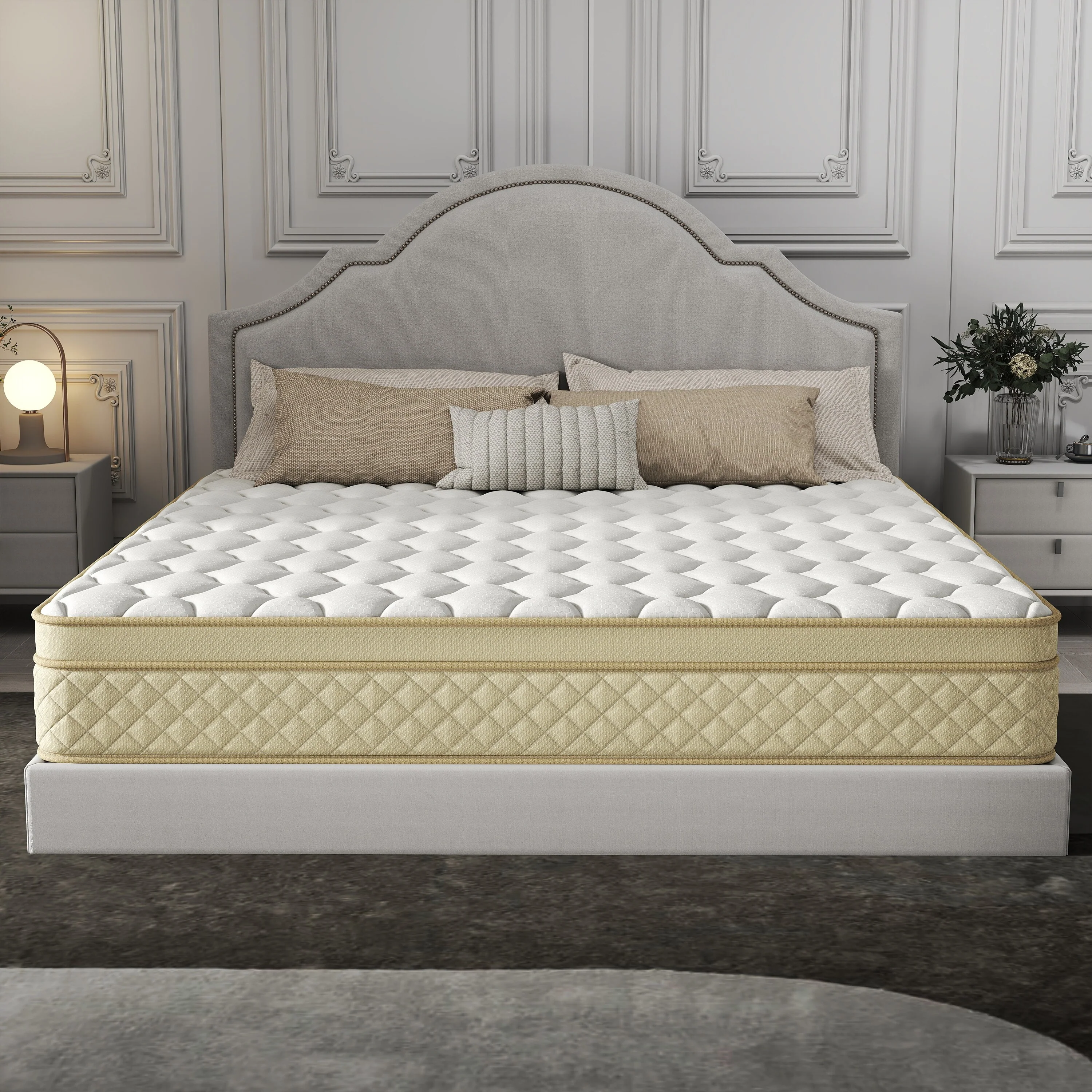 This spring mattress has a high-end and comfortable knit fabric with a comfortable and breathable surface. 35cm (14 Inch) height hybrid mattress combines the traditional support of an innerspring mattress with memory foam for a medium feel. Dual foam layers designed for optimal softness and support provide cushioning and serve as a protective buffer, thus relieve the painful pressure points on the body. The memory foam hybrid mattress is compressed, vacuum sealed, and neatly rolled up in a box for high-efficient delivery. They fit all frames, such as box spring, floor, slatted base, flat platform,etc.