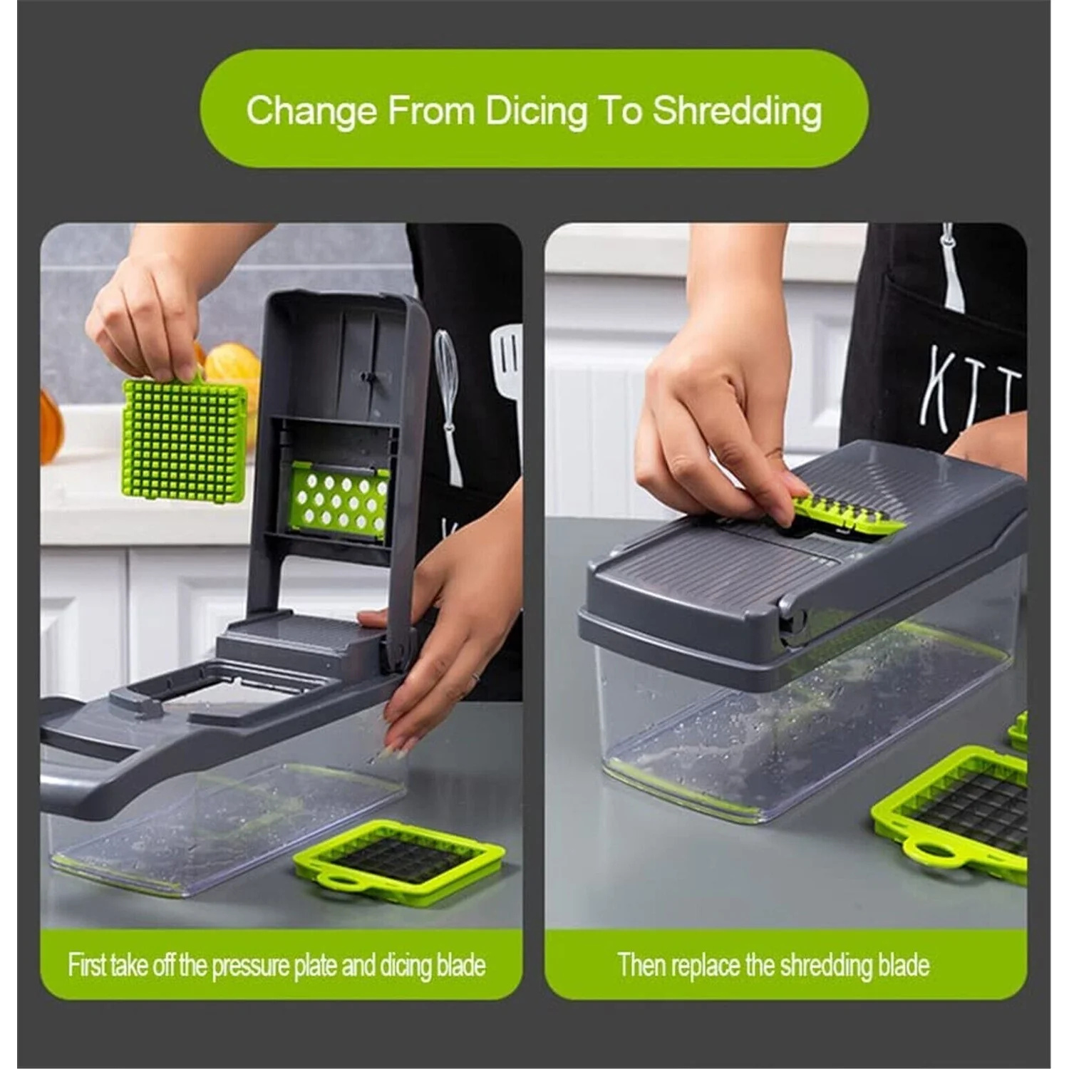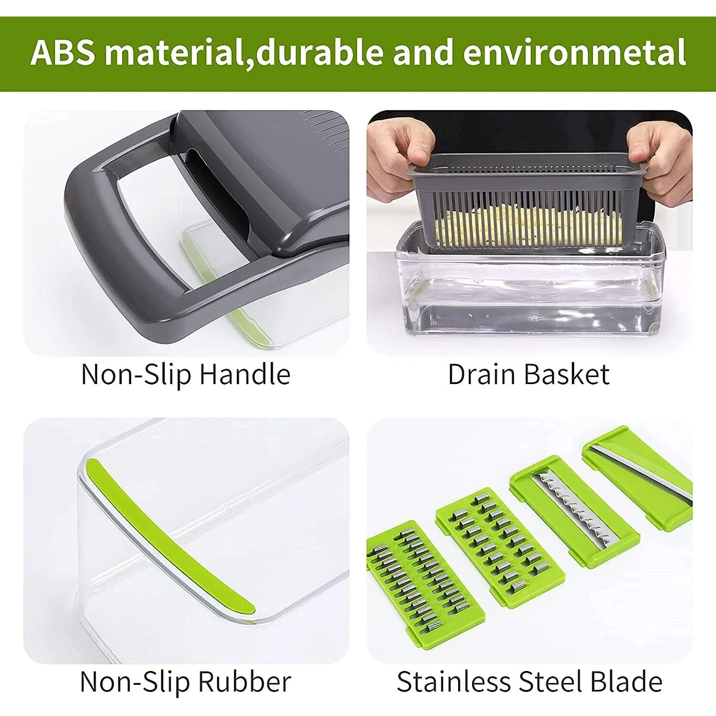 - 14 in 1 Multifunctional vegetable chopper allows you can get big or small dices, thick or thin slice, shreds or julienne. Easy to chop onion, mushroom, cucumber, carrot, potato, ginger, garlic, cheese. Easy disassemble and installation.