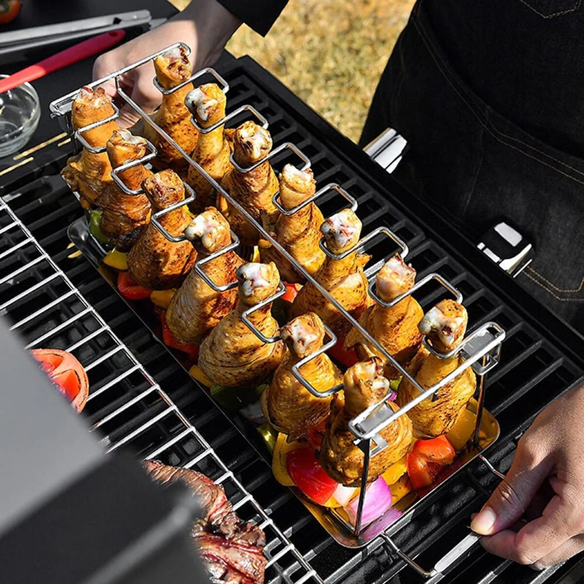 Material: Stainless Steel 14 legs, wings, thighs slots Slip-free & foldable design Grill Stand: 35 x 14.3 x 11.5cm (approx.) Pan Size: 46 x 14.5 x 3cm (approx.) Dishawasher safe
