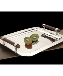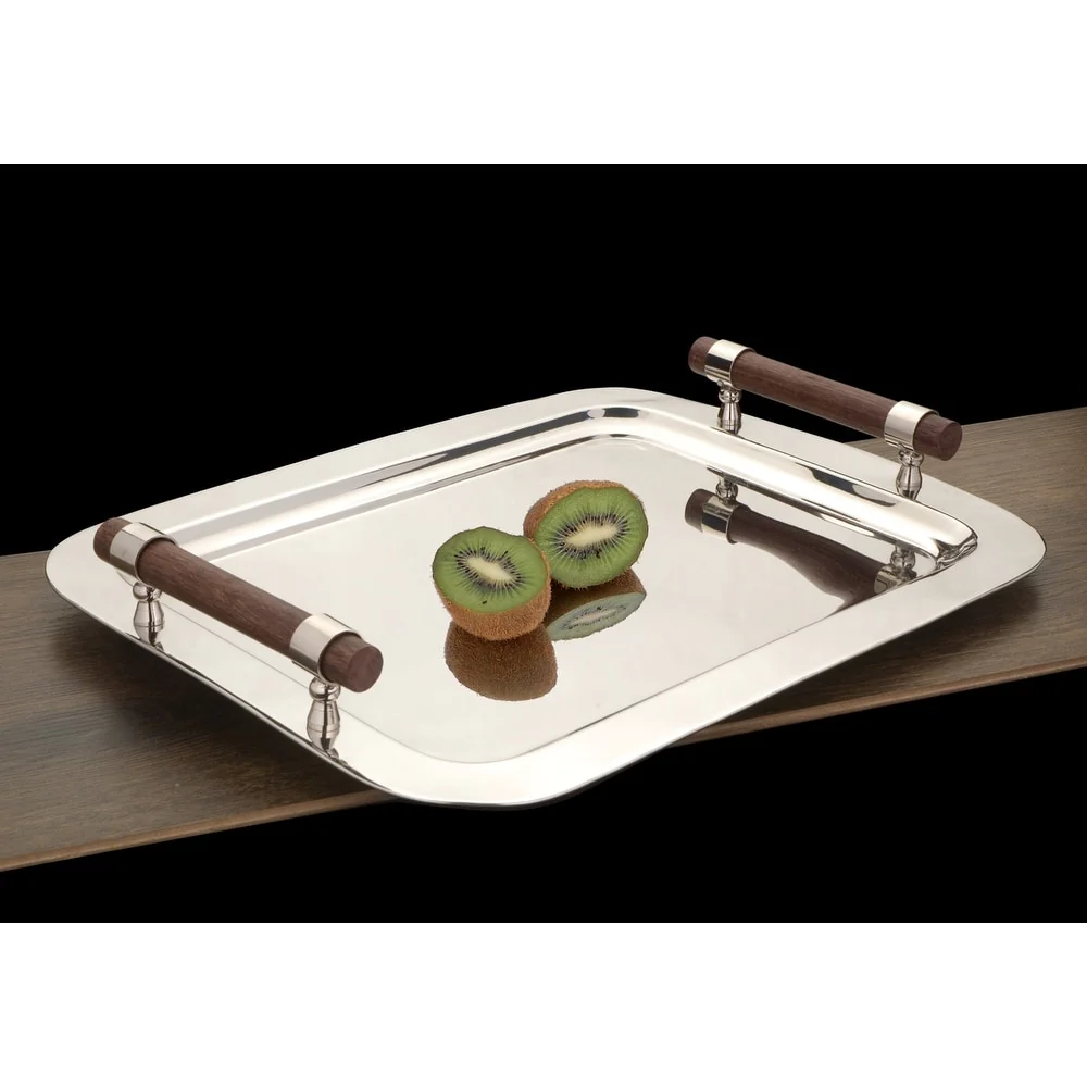 This 15.75 x  22" Stainless Steel Tray with Wood Handle combines sleek, modern design with practical functionality. Made from durable, high-quality stainless steel, the tray offers a smooth, easy-to-clean surface perfect for serving food or displaying items.  Its spacious design provides ample room for various items, from appetizers to beverages. The wooden handles on either side ensure a comfortable, secure grip, adding a natural, warm contrast to the cool, polished stainless steel. Ideal for both casual and formal settings, this tray brings a touch of sophistication to any occasion while offering durability and ease of use.    Â
