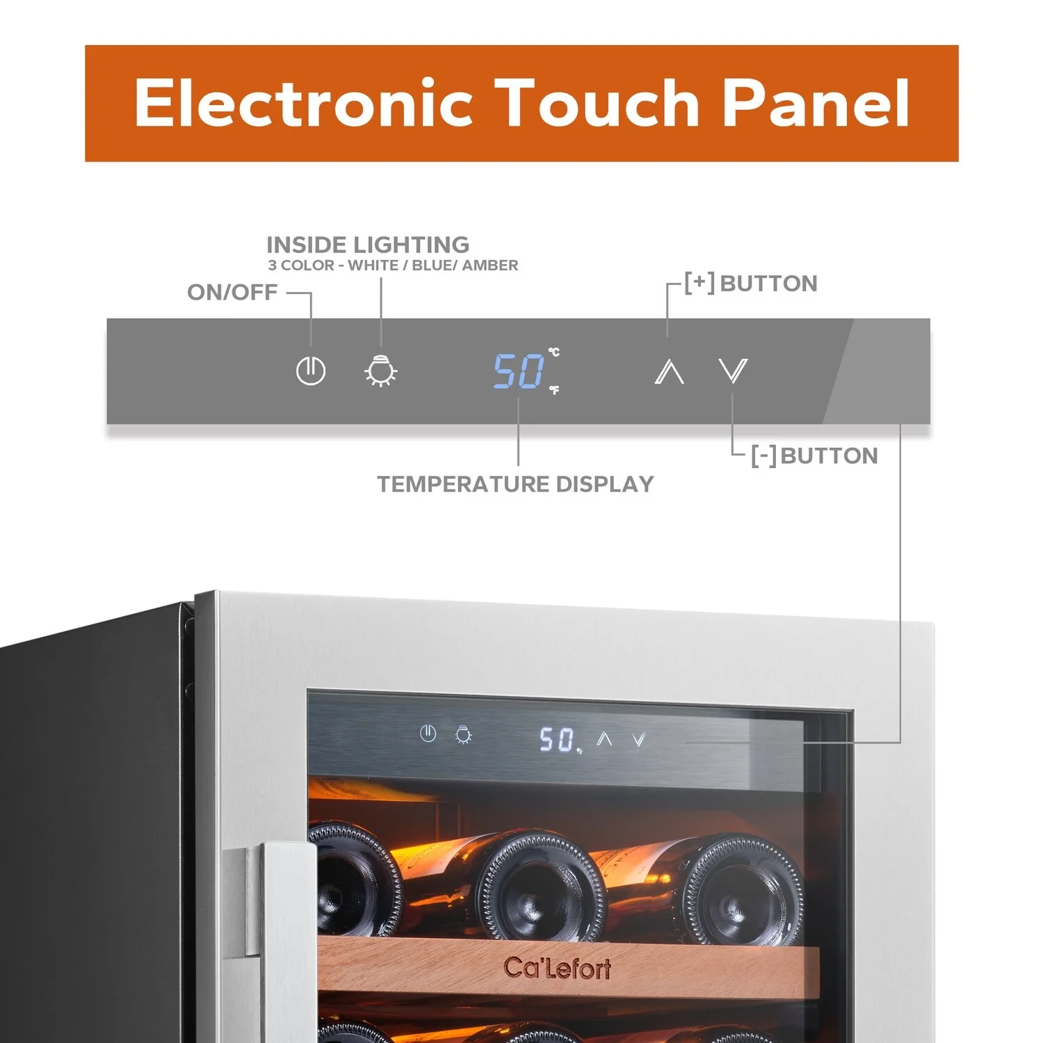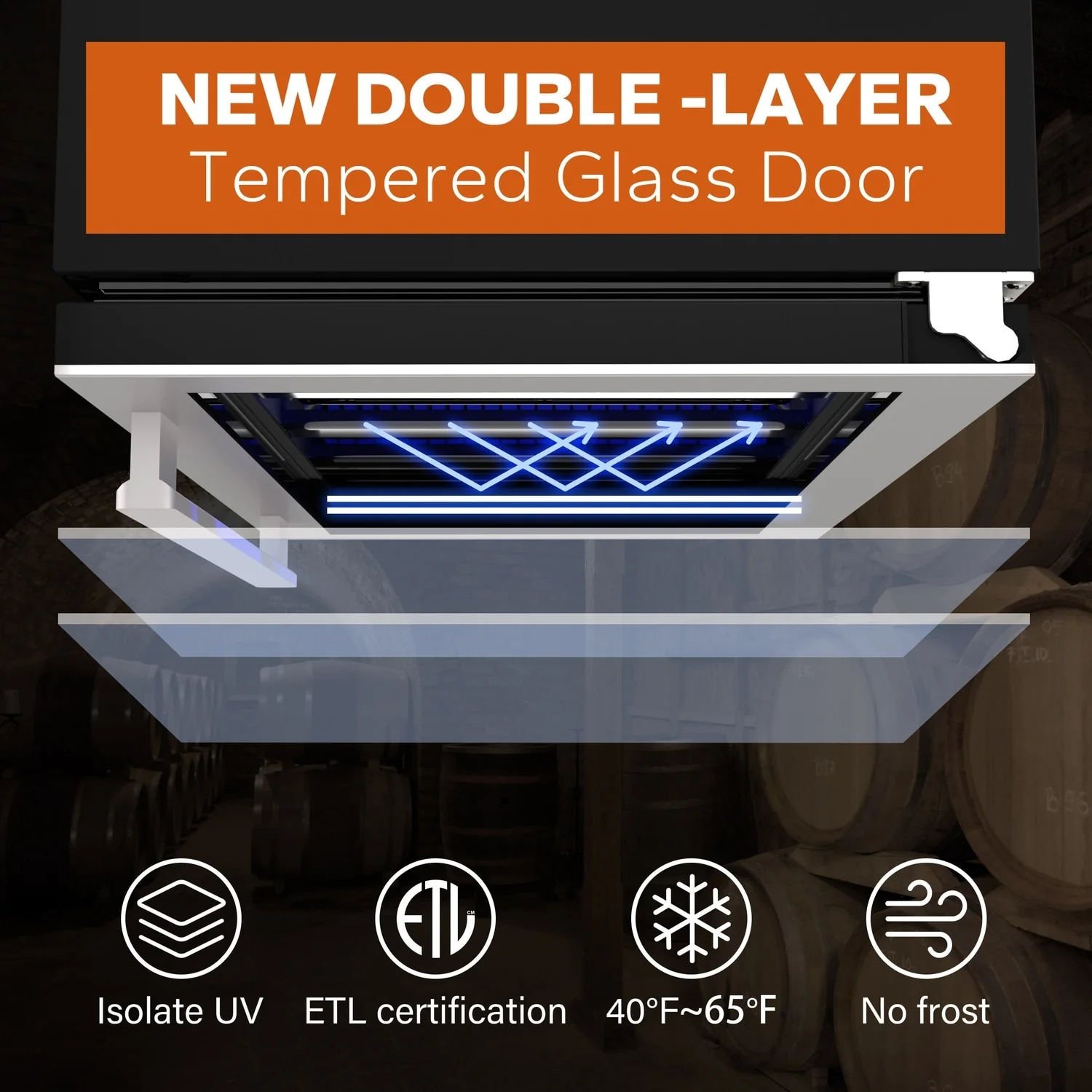The wine fridge comes with three color options for its LED lighting (blue, white, and amber), allowing you to tailor the ambiance of your wine storage area. Its sleek stainless steel door with a seamless, fingerprint-resistant design is complemented by a hidden hinge, making it an elegant and functional addition to your kitchen, bar, or living space. This wine cooler not only protects your wines but also elevates the aesthetic of your home. - Efficient and Safe Wine Storage