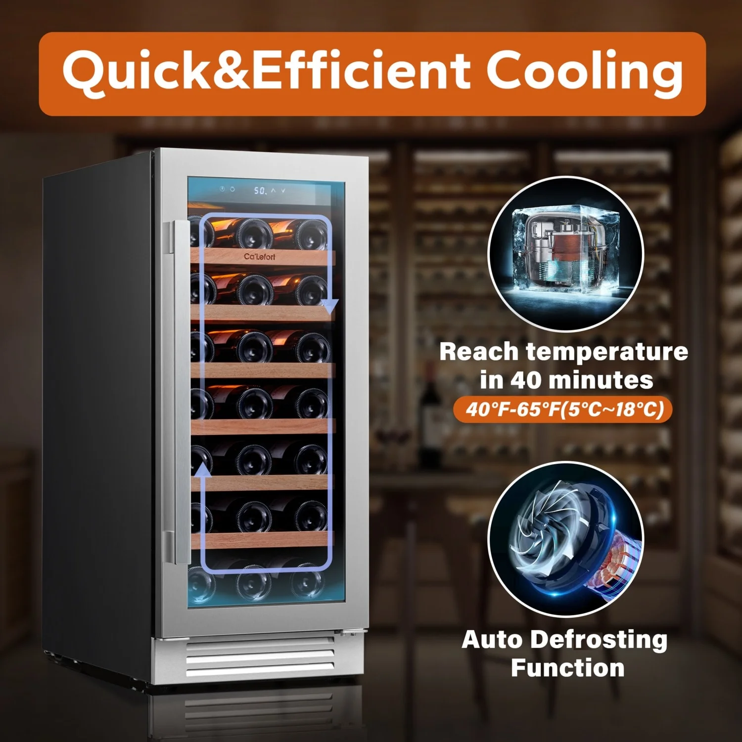 This 15-inch wine cooler fridge offers perfect storage for up to 33 bottles of your favorite wine with a temperature range of 40-65℉. Featuring a sleek, modern design with a stainless steel fingerprint-resistant door and customizable LED lights, it ensures your wines are stored at the optimal temperature. The built-in fan and active carbon deodorizer keep the air clean and fresh. The bottom door lock provides added security for your wine collection.
