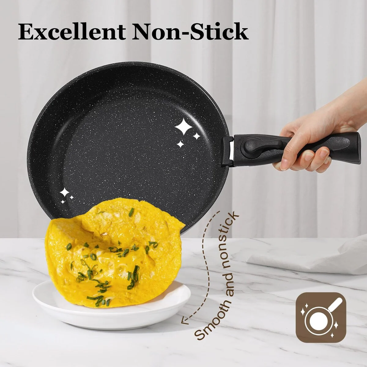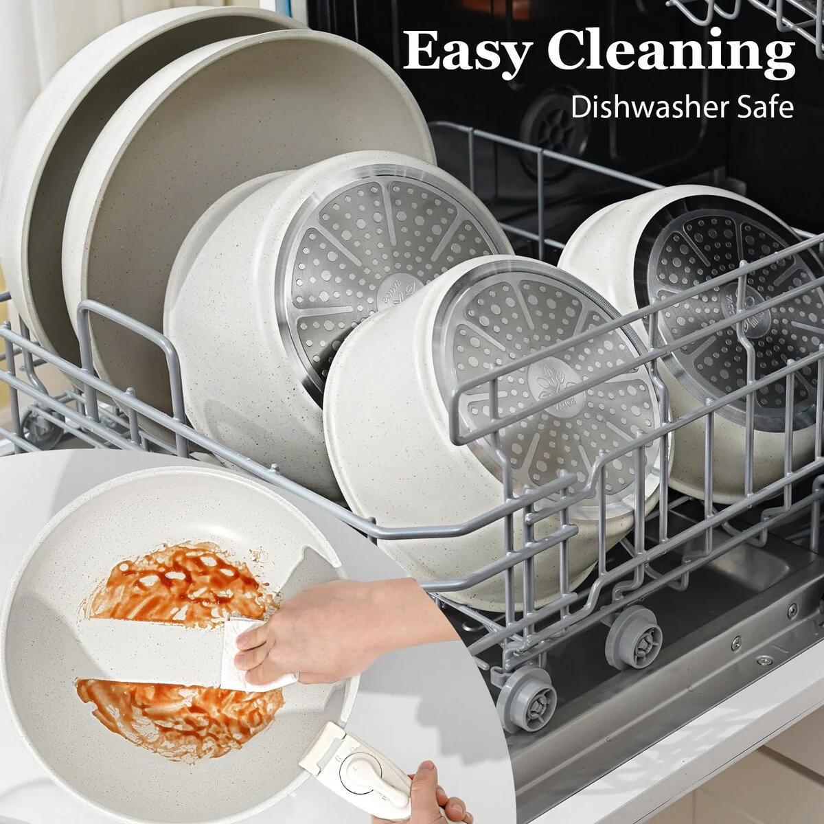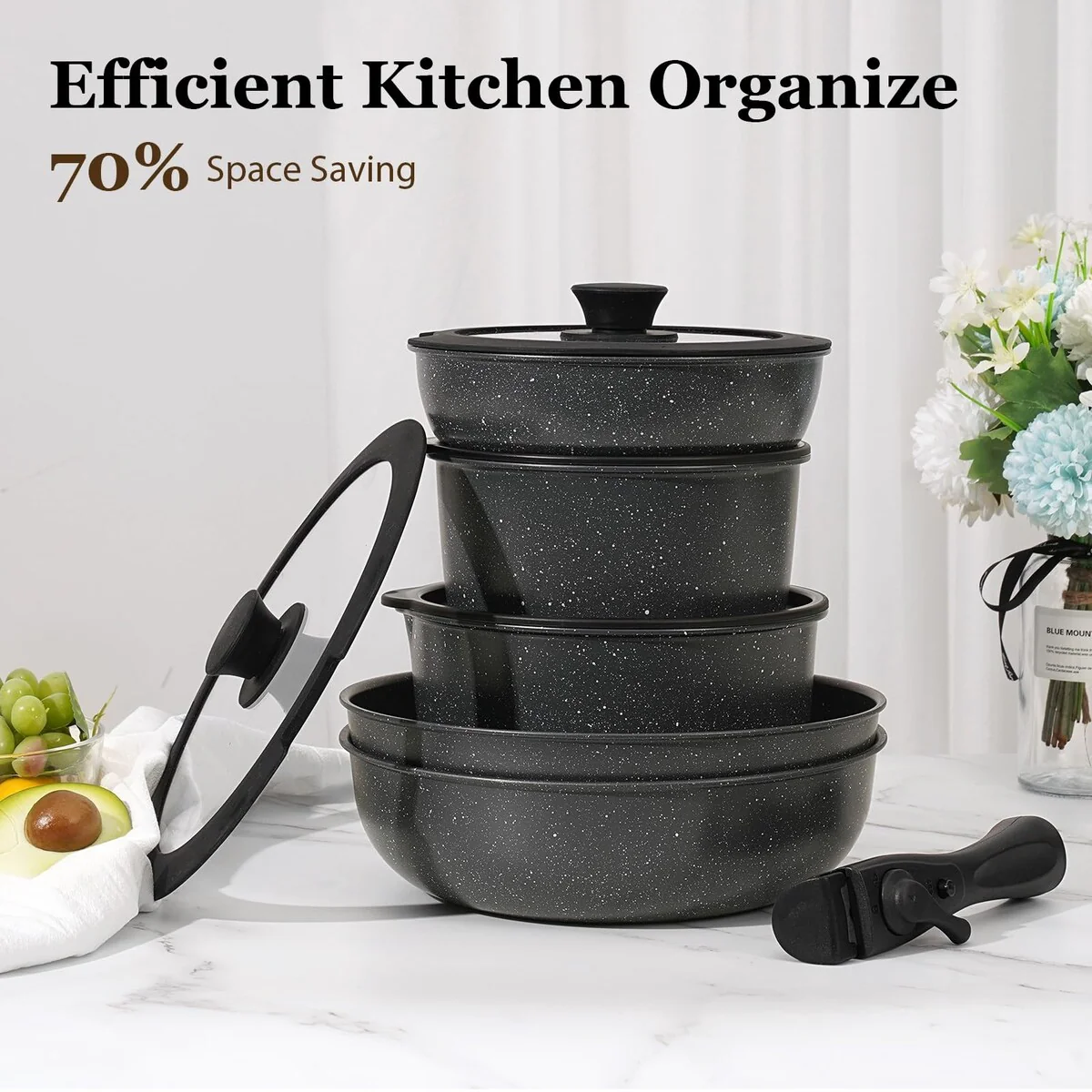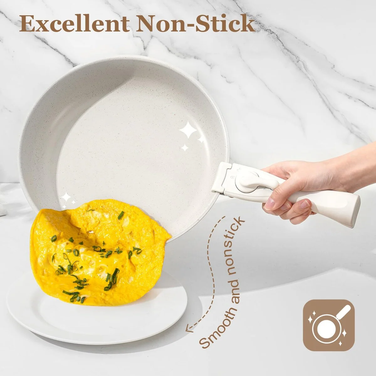 Space-Saving Storage : Pots and pans set with detachable handles allow for compact nesting, optimizing 75% kitchen cabinet space and providing a clutter-free cooking environment,making for easy storage in cabinets or RVs.